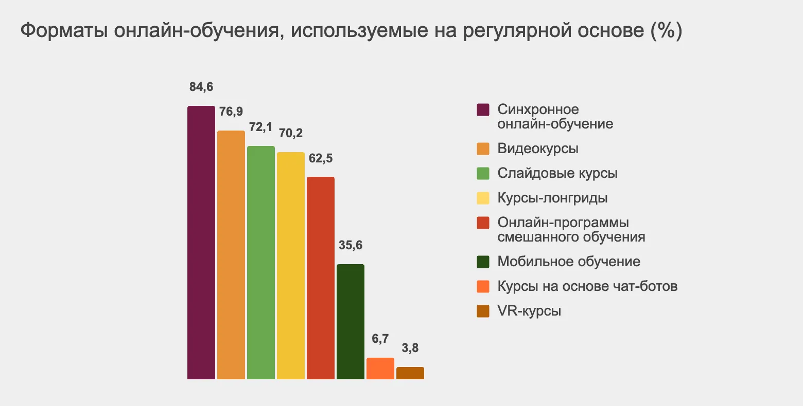 Топ популярных форматов онлайн-обучения в 2024 году остался неизменным. На первом месте по-прежнему находятся следующие форматы: