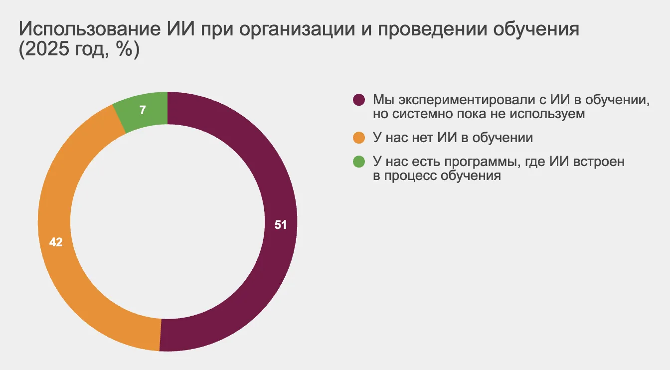 За последний год доля компаний, систематически внедряющих искусственный интеллект в обучение сотрудников, увеличилась более чем в три раза — с 2% до 7%. Вместе с тем, 42% опрошенных организаций не применяют ИИ в своих учебных программах. Это свидетельствует о растущем интересе к технологиям ИИ в сфере корпоративного обучения, однако значительная часть компаний все еще не использует эти возможности.