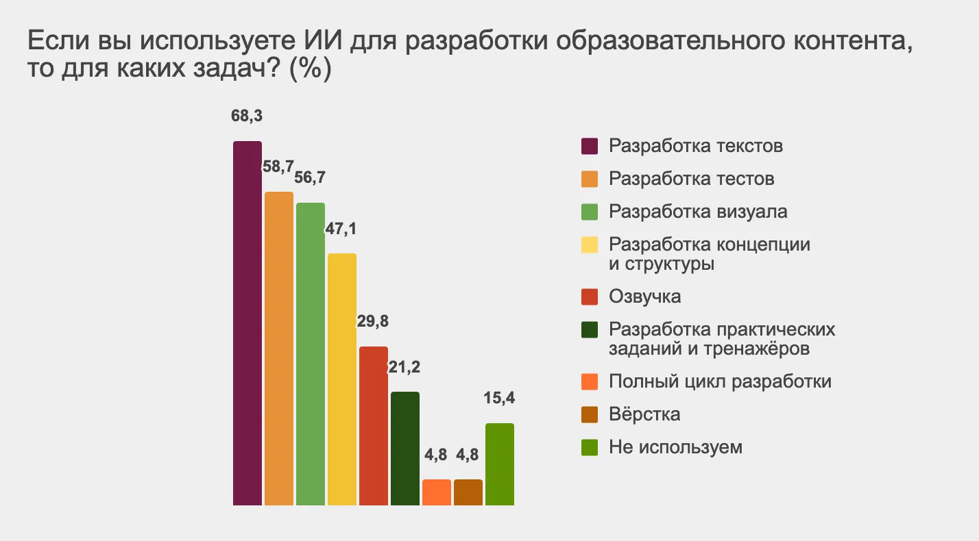 Согласно опросу, значительное число участников использует нейросети для создания различных материалов для курсов. 68,3% респондентов генерируют тексты, 58,7% — тестовые задания, а 56,7% — визуальные материалы. Почти половина опрошенных (47,1%) применяет искусственный интеллект для разработки концепции и структуры курсов. 29,8% используют технологии ИИ для озвучивания текста, 21,2% — для создания практических заданий и тренажёров. Лишь 4,8% участников отметили, что в их организациях искусственный интеллект внедрён в полный цикл производства курсов. Внедрение ИИ в образовательный процесс открывает новые возможности для повышения качества и эффективности обучения.