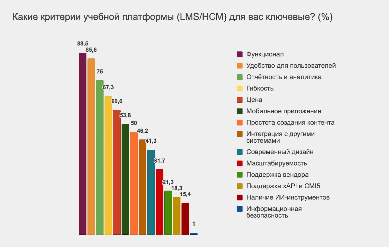 Опрос свидетельствует о том, что приоритеты компаний при выборе платформы для обучения сотрудников (LMS) остаются неизменными на протяжении последних трех лет. В числе основных критериев, которые принимаются во внимание, находятся следующие аспекты: