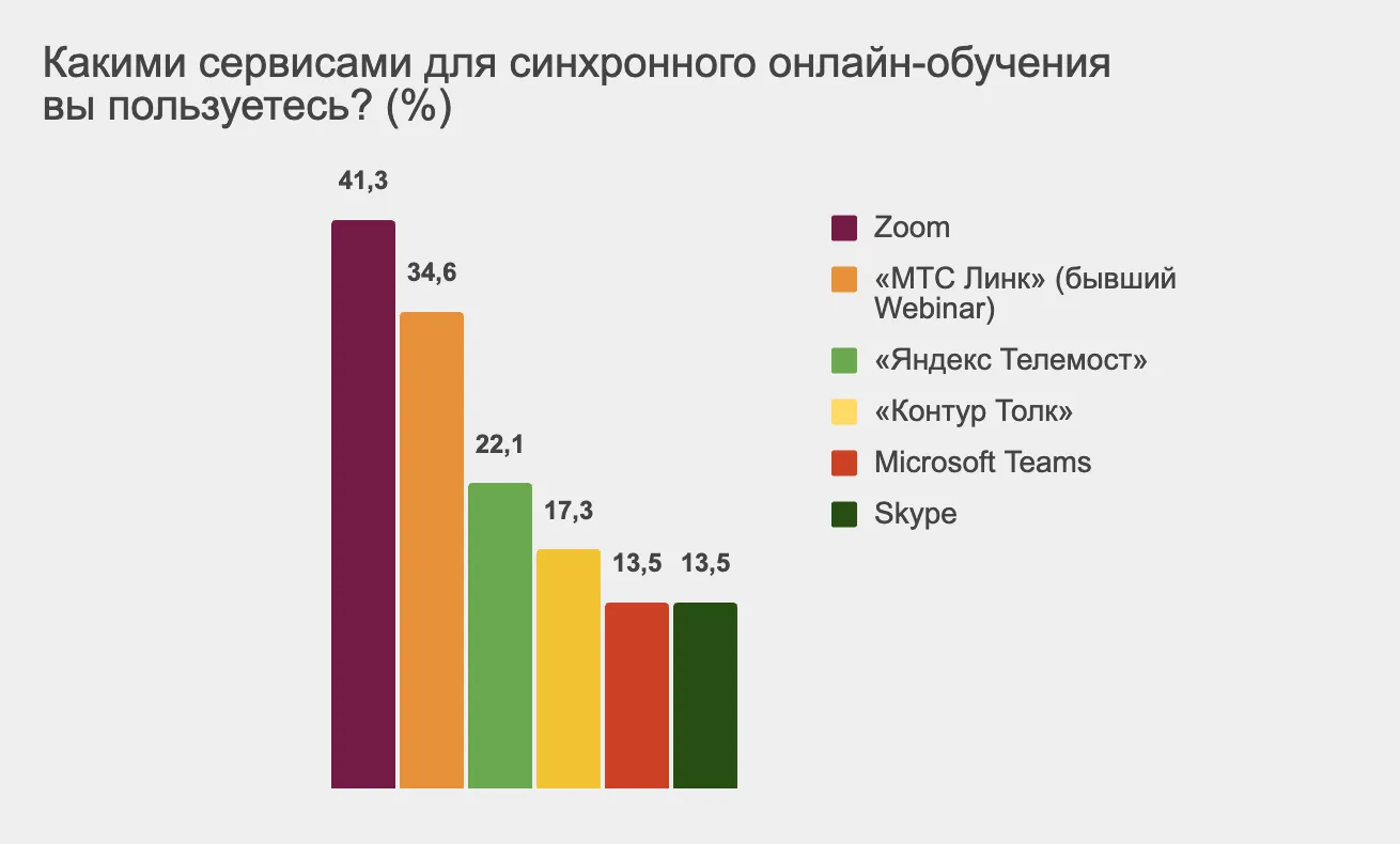 Среди платформ для синхронного онлайн-обучения лидером остается Zoom, который используется 41,3% респондентов. Однако его доля снизилась с 50% в 2024 году. В то же время растет популярность российских сервисов, таких как «МТС Линк», который занимает 34,6% рынка, и «Яндекс Телемост» с 22,1%. Также стоит отметить новый отечественный продукт «Контур Толк», который в 2024 году начал упоминаться всего 5% опрошенных, а в 2025 году его популярность возросла до 17,3%. Половина респондентов заявила о использовании двух и более платформ для онлайн-обучения одновременно.