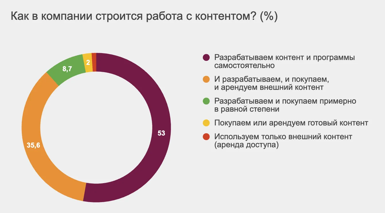 Павел Безяев отмечает, что текущие результаты удивляют его, так как свидетельствуют о наличии специалистов по созданию контента не только в крупных, но и в средних и малых компаниях. Он подчеркивает, что создание контента в своей сфере, учитывая продуктовые и внутренние особенности, не является проблемой. Тем не менее, контент по общим темам, таким как софт-скиллы, чаще всего арендуется. К сожалению, наблюдается тенденция, когда компании в таких отраслях, как нефть, газ, транспорт и другие, разрабатывают курсы по лидерству, тайм-менеджменту и эмоциональному интеллекту, уверенные в наличии у себя этой экспертизы. Павел подчеркивает, что это негативно сказывается на рынке разработки качественного учебного контента.