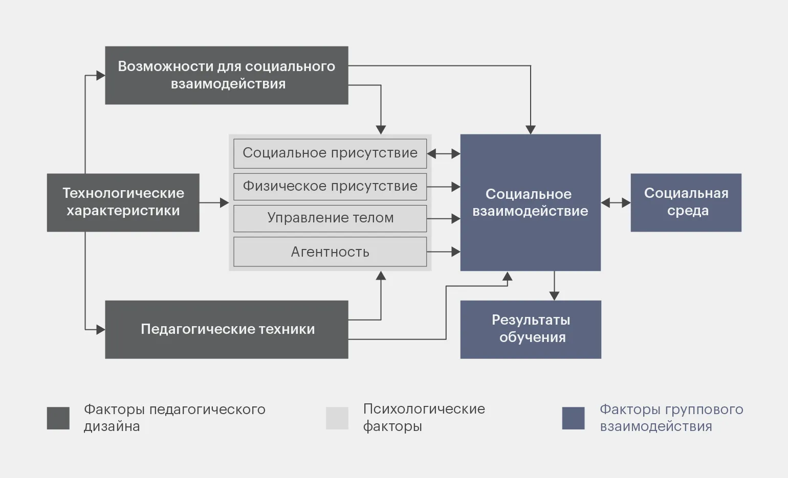 Социальное присутствие играет важную роль в образовательном процессе, когда студенты осознают, что преимущества совместной работы перевешивают затраты на её организацию. К таким затратам относятся технологические сложности, с которыми сталкиваются обучающиеся, а также время и усилия, необходимые для координации групповой деятельности и понимания инструкций к заданиям. Исследования показывают, что высокий уровень социального присутствия не всегда способствует эффективному обучению. Например, в социальных сетях уровень взаимодействия высок, но это не гарантирует получение познавательной пользы. Важно, чтобы образовательные платформы и инструменты способствовали не только взаимодействию, но и эффективному обучению, обеспечивая студентов необходимыми ресурсами и поддержкой для достижения учебных целей.
