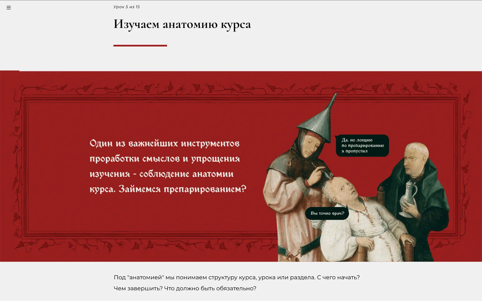 - Специфика темы обучения. Придумывать персонажей или связывать учебный контент, например, с какой-нибудь фантастической вселенной вообще уместно не для каждой учебной темы. Вникнуть в историю, в которую разработчики упаковали учебный курс, или разобрать отсылки к произведениям поп-культуры тоже требует от учащегося некоторых мыслительных усилий. И если тема курса сложная, то лишние элементы могут вызвать когнитивную перегрузку и не поспособствовать пониманию материала, а помешать этому.