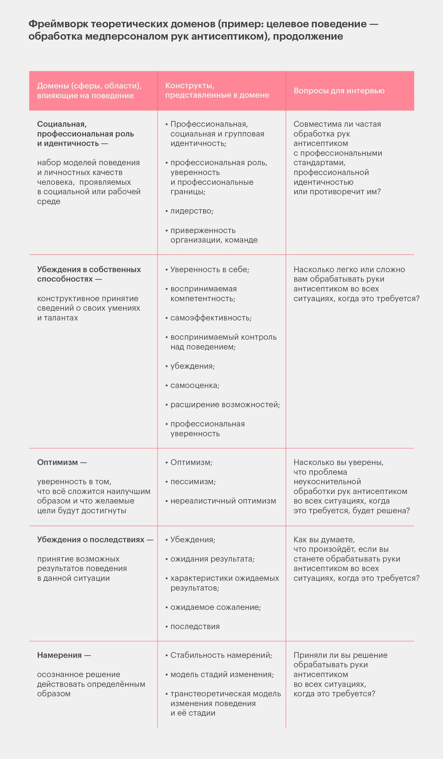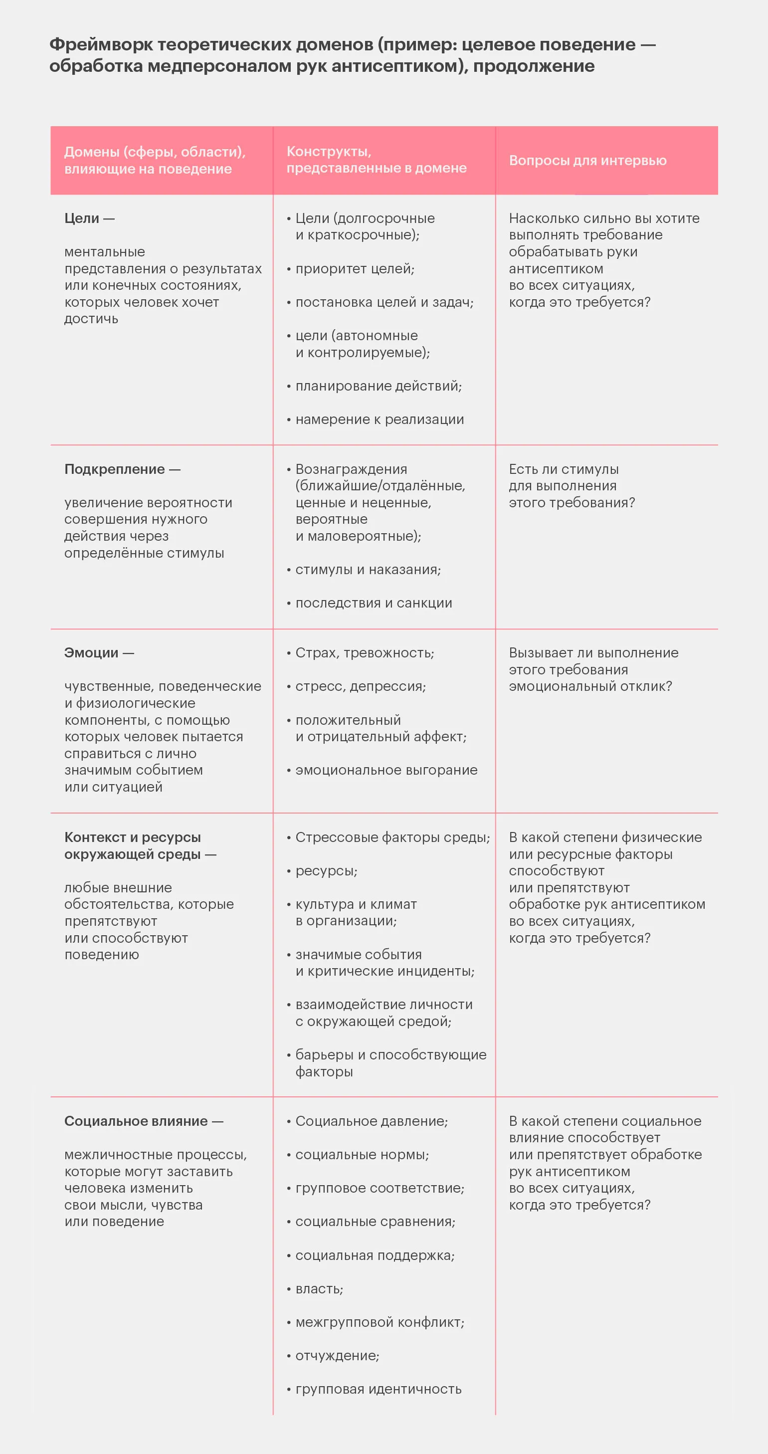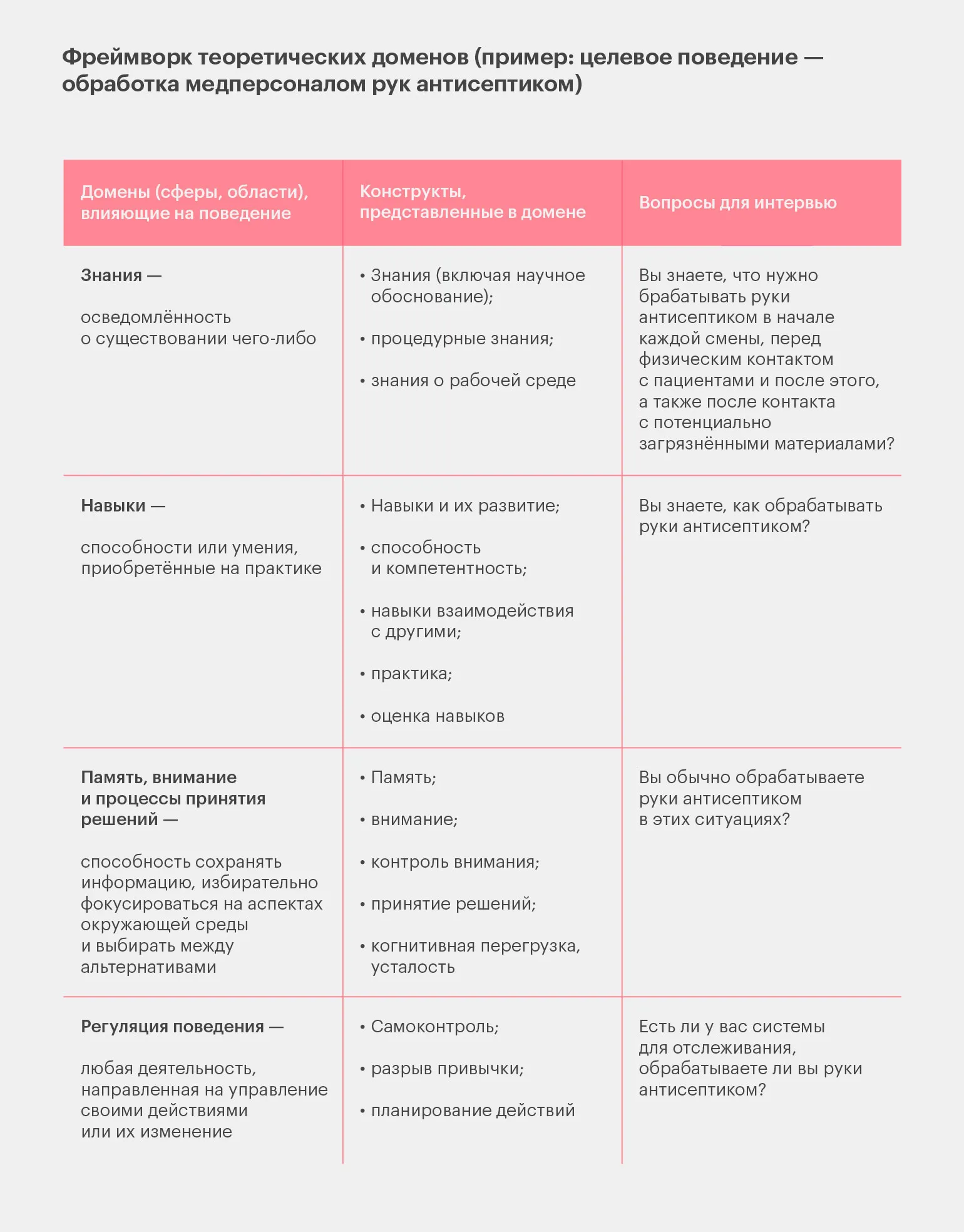 Фреймворк предоставляет набор вопросов для проведения интервью с людьми, чье поведение необходимо изменить. Каждый вопрос ориентирован на определенную область влияния на поведение, что позволяет более глубоко проанализировать ситуацию. В приведенной ниже таблице мы демонстрируем это на примере обработки рук. Данная таблица является упрощенной адаптацией и не полностью повторяет оригинал, представленный в книге авторов модели COM-B.