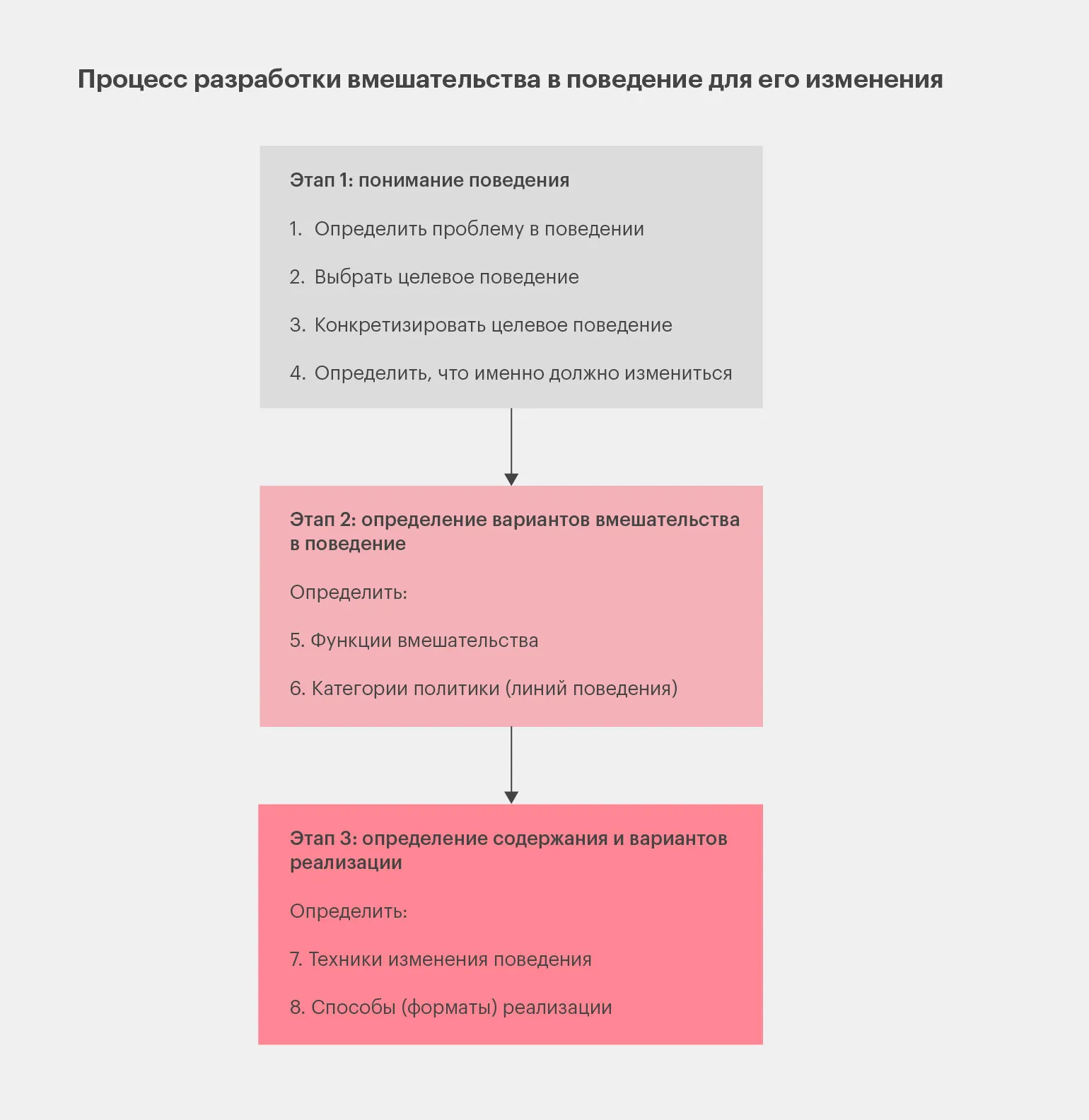 На третьем этапе необходимо определить содержание и методы реализации выбранных вмешательств. Схематично различные виды вмешательств представлены в таксономии, известной как колесо изменения поведения. В данной статье акцент будет сделан на первом этапе — анализе поведения, где применяется модель COM-B. Именно от этого анализа зависят последующие этапы разработки эффективных вмешательств.