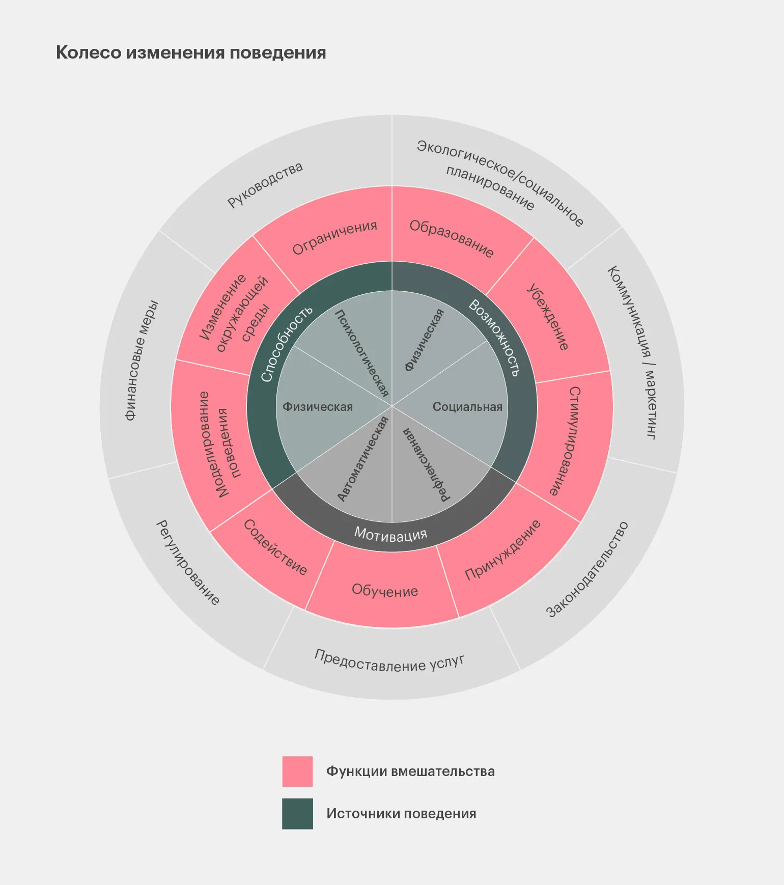 Авторы модели COM-B и колеса изменения поведения утверждают, что разработали этот подход, основываясь на известных фреймворках изменения поведения. Они интегрировали ключевые элементы этих моделей, чтобы создать целостную и систематическую методологию, способствующую эффективному изменению поведения. Это объединение различных подходов позволяет глубже понять механизмы, влияющие на изменения в поведении, и предоставляет инструменты для их успешной реализации.
