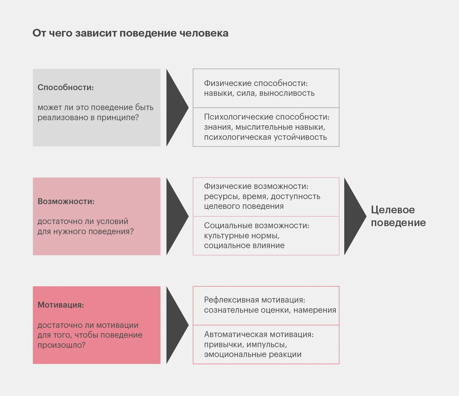 Для эффективного воздействия на поведение необходимо провести анализ трех ключевых факторов, чтобы выявить основную проблему. Важно определить, связана ли проблема с недостатком способностей или возможностей у людей, либо же с низкой мотивацией. В зависимости от результатов анализа следует выбирать соответствующий метод вмешательства, который поможет устранить выявленные препятствия и улучшить поведение.