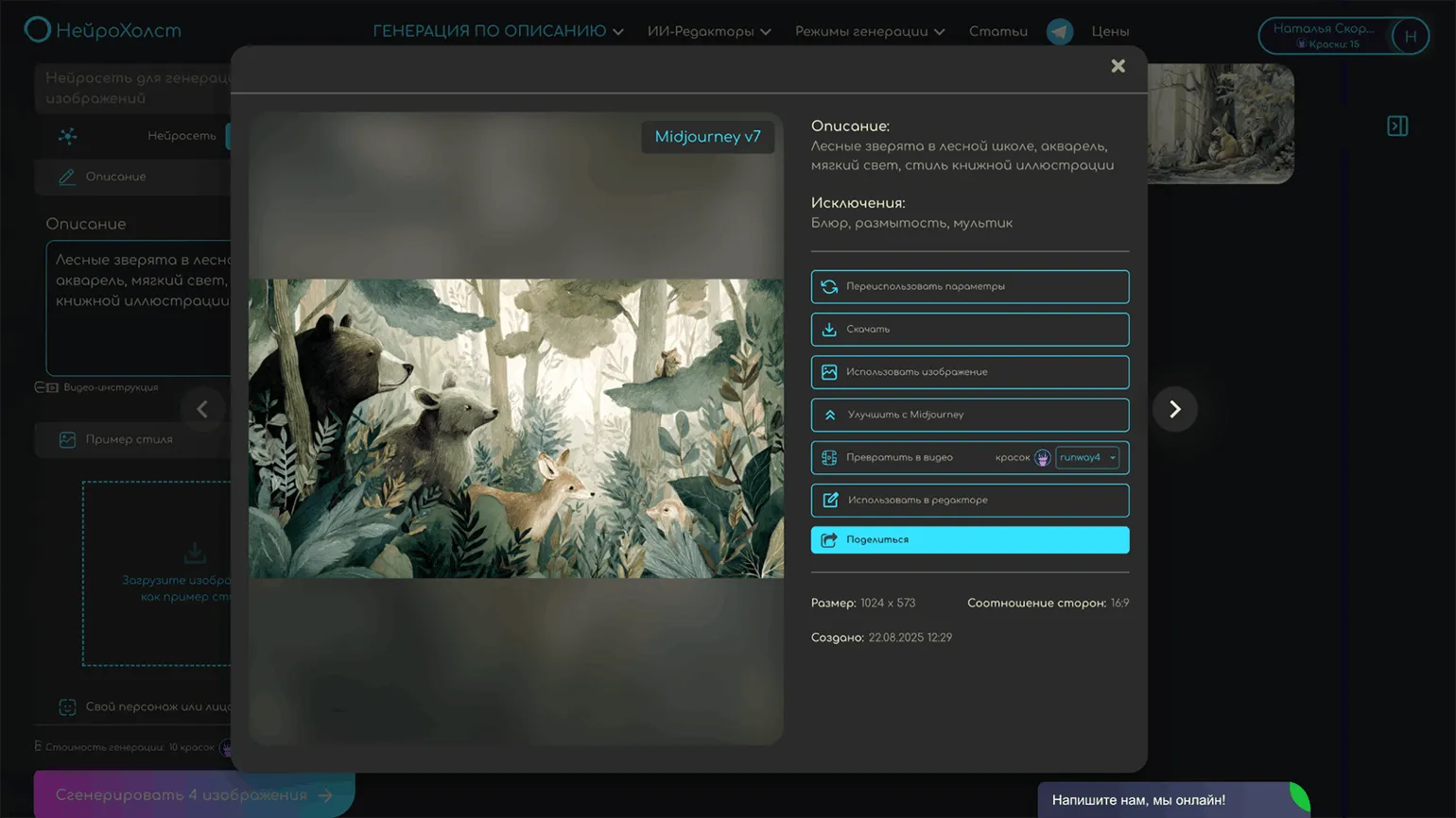 Нейросеть «Сбера» эффективно обрабатывает запросы на русском языке и предоставляет разнообразные инструменты для генерации изображений в различных стилях и для разных целей. Пользователи могут задать соотношение сторон изображения, выбрать один из готовых стилей (наиболее широкий выбор доступен на сайте Fusion Brain) или описать стиль самостоятельно. Также возможно добавление негативного промпта, что позволяет указать, какие элементы не должны присутствовать на изображении. Телеграм-бот Kandinsky предлагает функционал для создания стикеров и аватаров, переносит стиль одной картинки на другую, смешивает загруженные изображения и генерирует их вариации. Кроме того, в боте GigaChat доступна функция создания коротких видео. Эти инструменты значительно упрощают процесс создания визуального контента и позволяют пользователям реализовать свои креативные идеи.