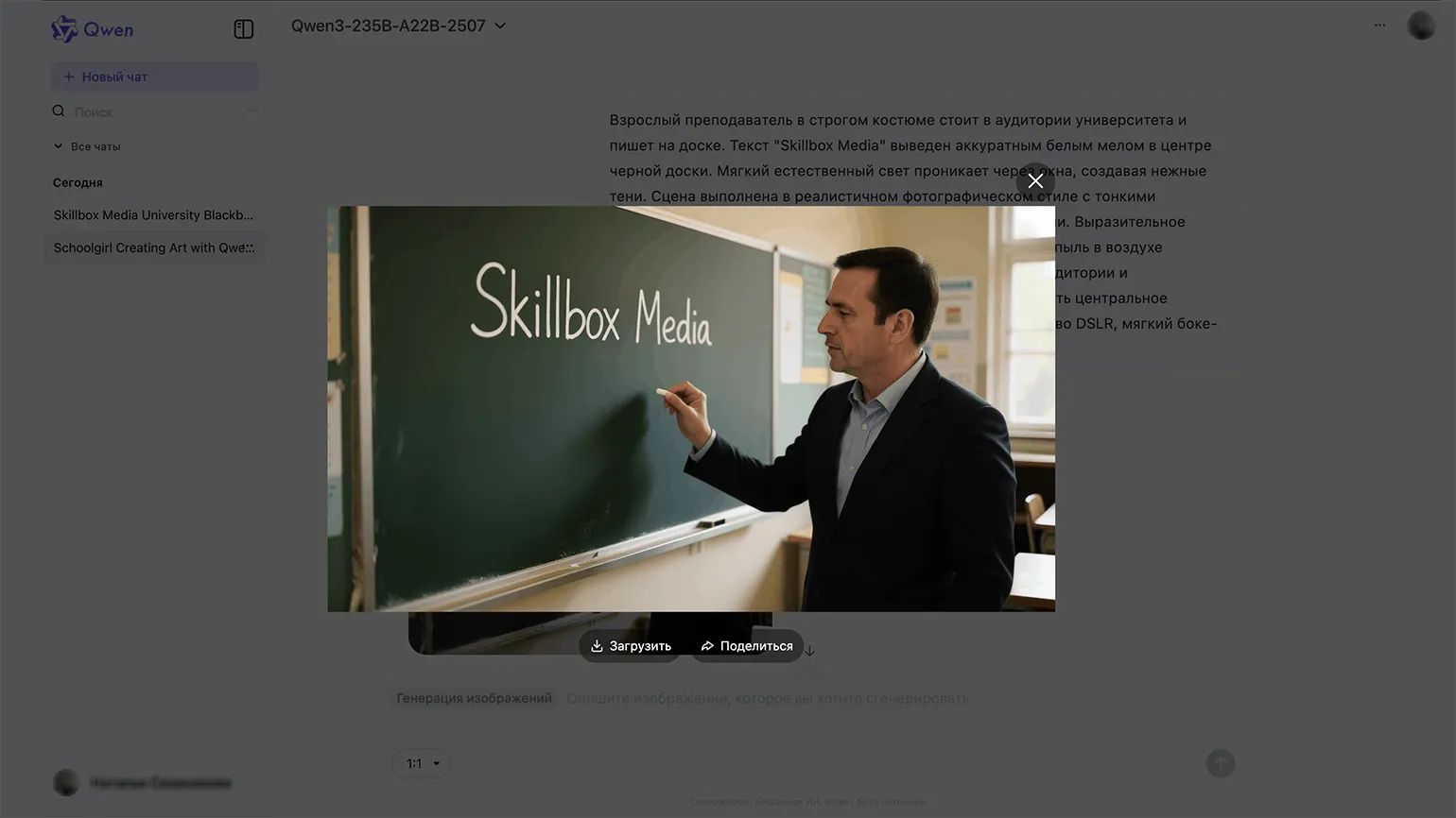 Перед созданием изображения вы можете выбрать соотношение сторон и использовать промпты из примеров различных стилей, предложенных нейросетью. Модель Qwen понимает запросы на русском языке, однако более эффективно работает с англоязычными промптами. Поскольку генерация изображений и текста происходит в одном сервисе, вы можете легко запросить у чата формулировку промпта или его перевод на английский язык и сразу использовать предложенный вариант от нейросети. Стоит отметить, что модель корректно воспроизводит текст на изображениях, но, к сожалению, не поддерживает кириллицу.