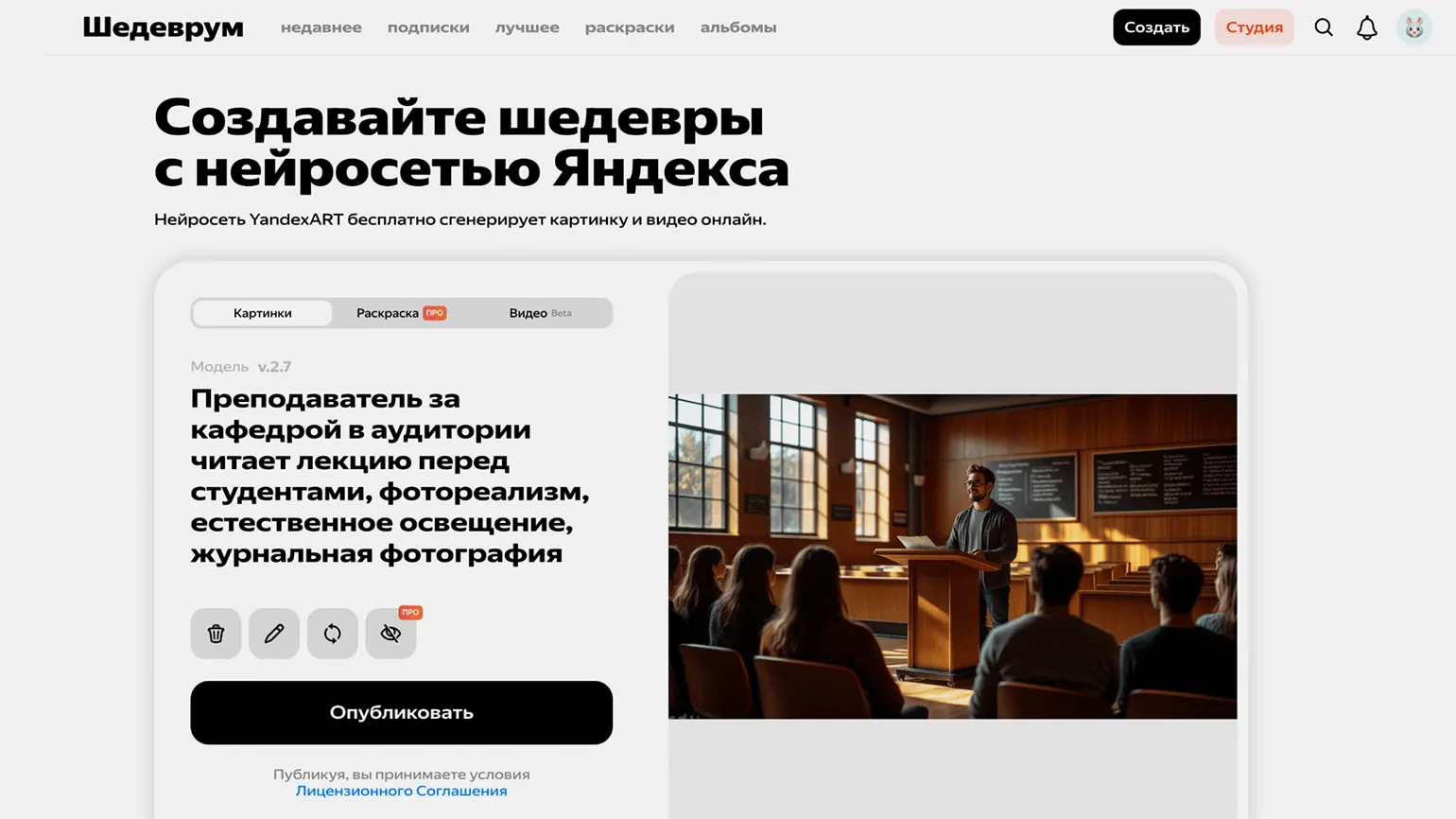 Стоимость и условия использования: в мобильных приложениях количество генераций не ограничено. На сайте пользователи могут создавать до 70 изображений и до 10 видеороликов в сутки. При подписке за 100 рублей в месяц данные ограничения снимаются, а также становятся доступны дополнительные премиум-функции.
