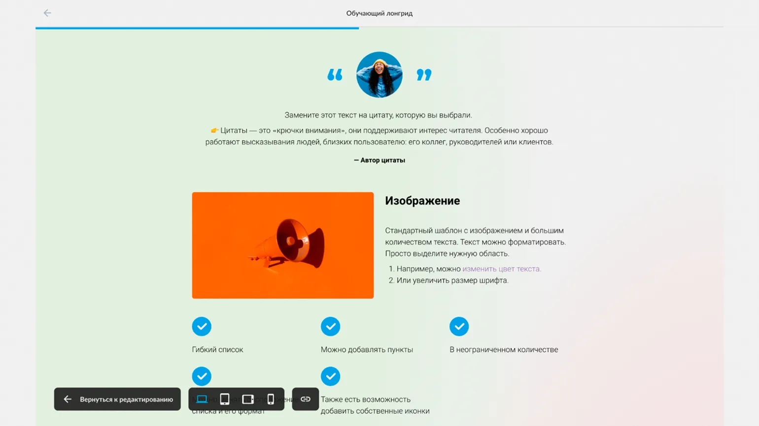 Сервис предназначен для создания онлайн-курсов в формате интерактивных лонгридов. Он предоставляет пользователям инструменты для разработки образовательного контента, который способствует глубокому вовлечению и эффективному обучению. Интерактивные лонгриды позволяют не только передавать знания, но и стимулировать активное участие обучающихся, что делает процесс обучения более захватывающим и продуктивным.