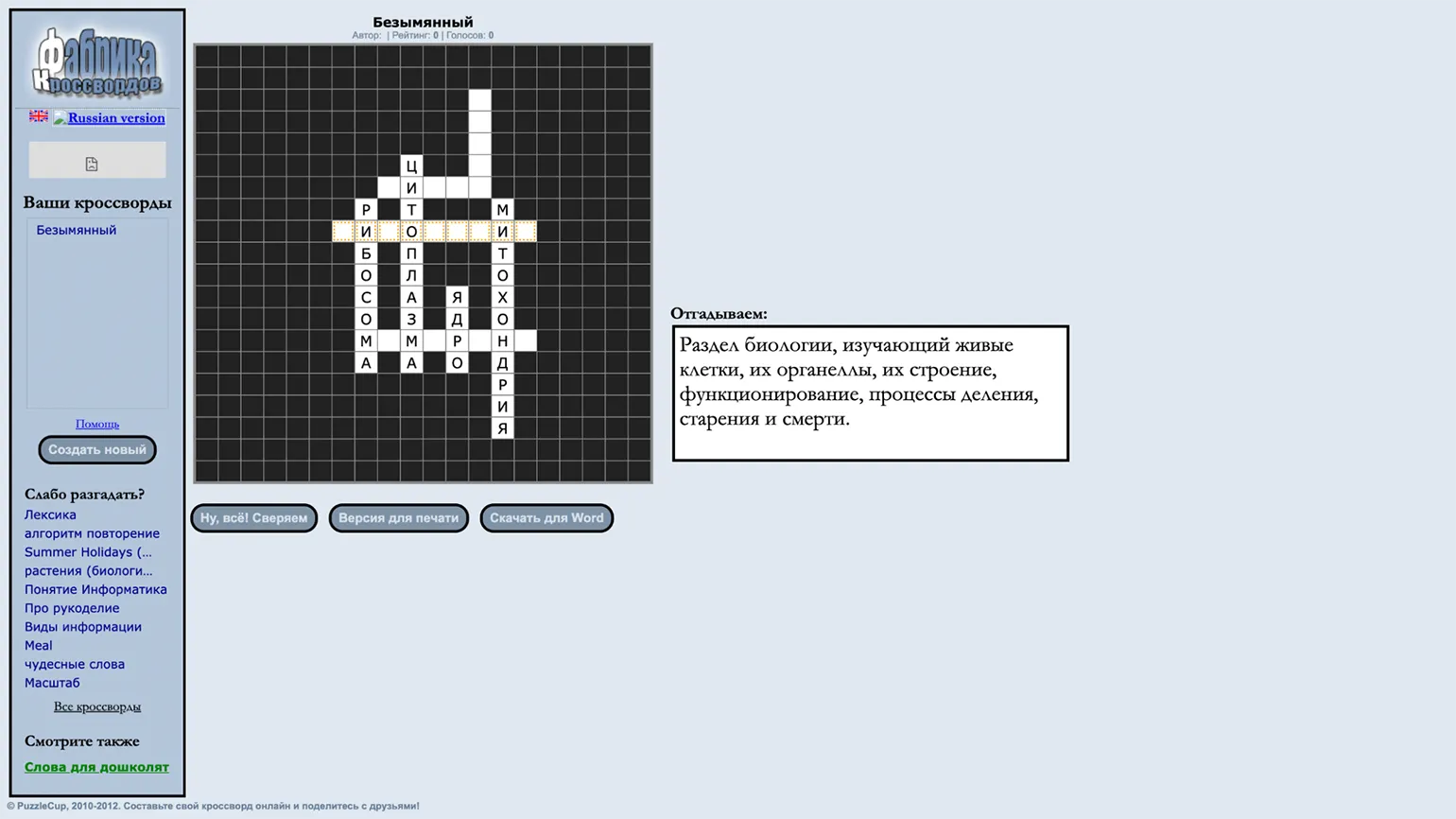 Готовый кроссворд можно будет найти по предоставленной ссылке. Также доступна версия для печати и возможность сохранить его в формате Word. Сервис не собирает статистику прохождения, поэтому такой кроссворд лучше всего подойдет для разминки на уроке или для закрепления изученного материала, а не для оценки знаний.
