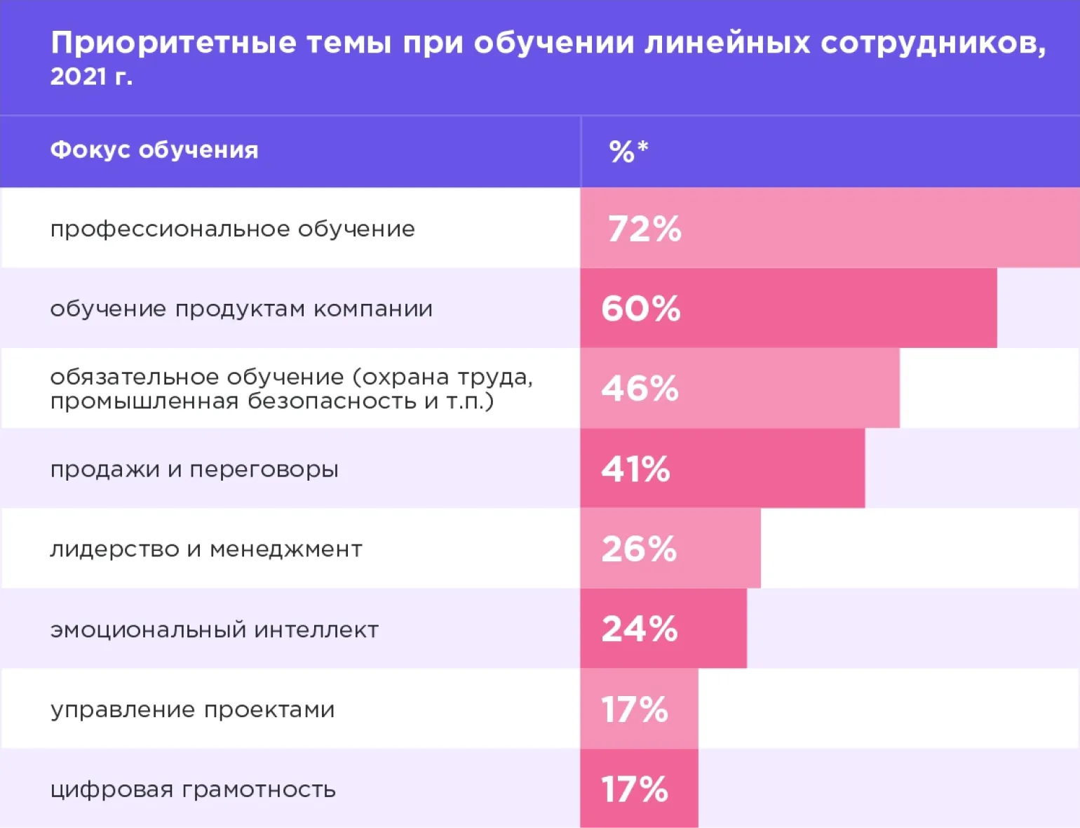 Большинство компаний, участвующих в опросе, акцентируют внимание на обучении линейных сотрудников профессиональным навыкам, что составляет 72%. Кроме того, 60% организаций проводят обучение, связанное с продуктами своей компании, в то время как около 46% обучают вопросам охраны труда и промышленной безопасности. Эти данные подчеркивают важность профессионального развития и соблюдения стандартов безопасности на рабочих местах.