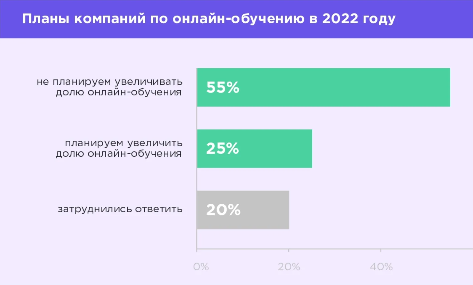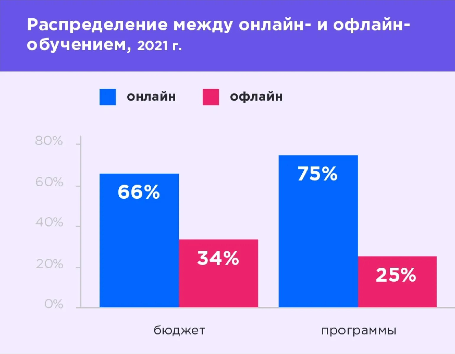 Форма обучения в корпоративной среде претерпела значительные изменения в результате пандемии. В настоящее время 75% корпоративных программ реализуются в онлайн-формате, и компании не намерены отказываться от этого подхода. При этом значительная часть бюджета — 66% — также направляется на онлайн-обучение. Хотя только 25% опрошенных организаций планируют увеличить долю онлайн-формата, большинство, а именно 55%, предпочитает сохранить существующее положение дел.