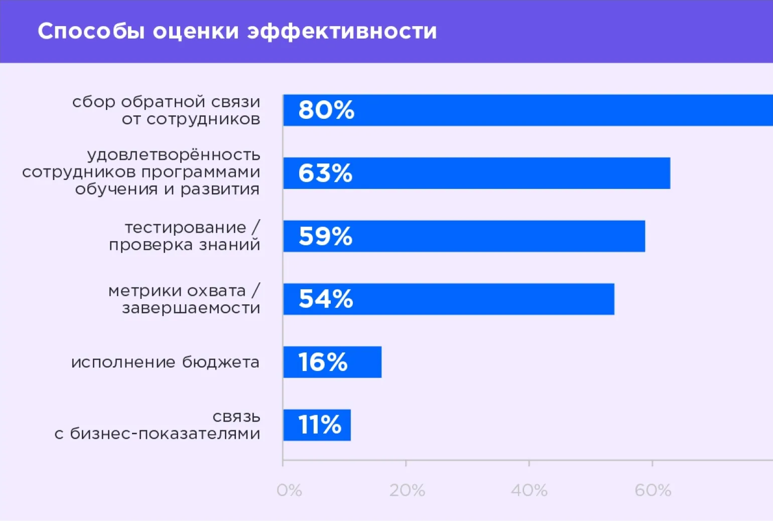 Авторы провели исследование инструментов оценки эффективности обучения, и результаты оказались противоречивыми. С одной стороны, лишь 11% компаний измеряют связь обучения с бизнес-показателями, что подразумевает оценку влияния программ на выручку или достижение целей. С другой стороны, наиболее распространёнными методами оценки остаются сбор обратной связи и измерение удовлетворённости сотрудников. Это подчеркивает необходимость внедрения более глубоких и целенаправленных подходов для оценки реального эффекта обучения на бизнес.