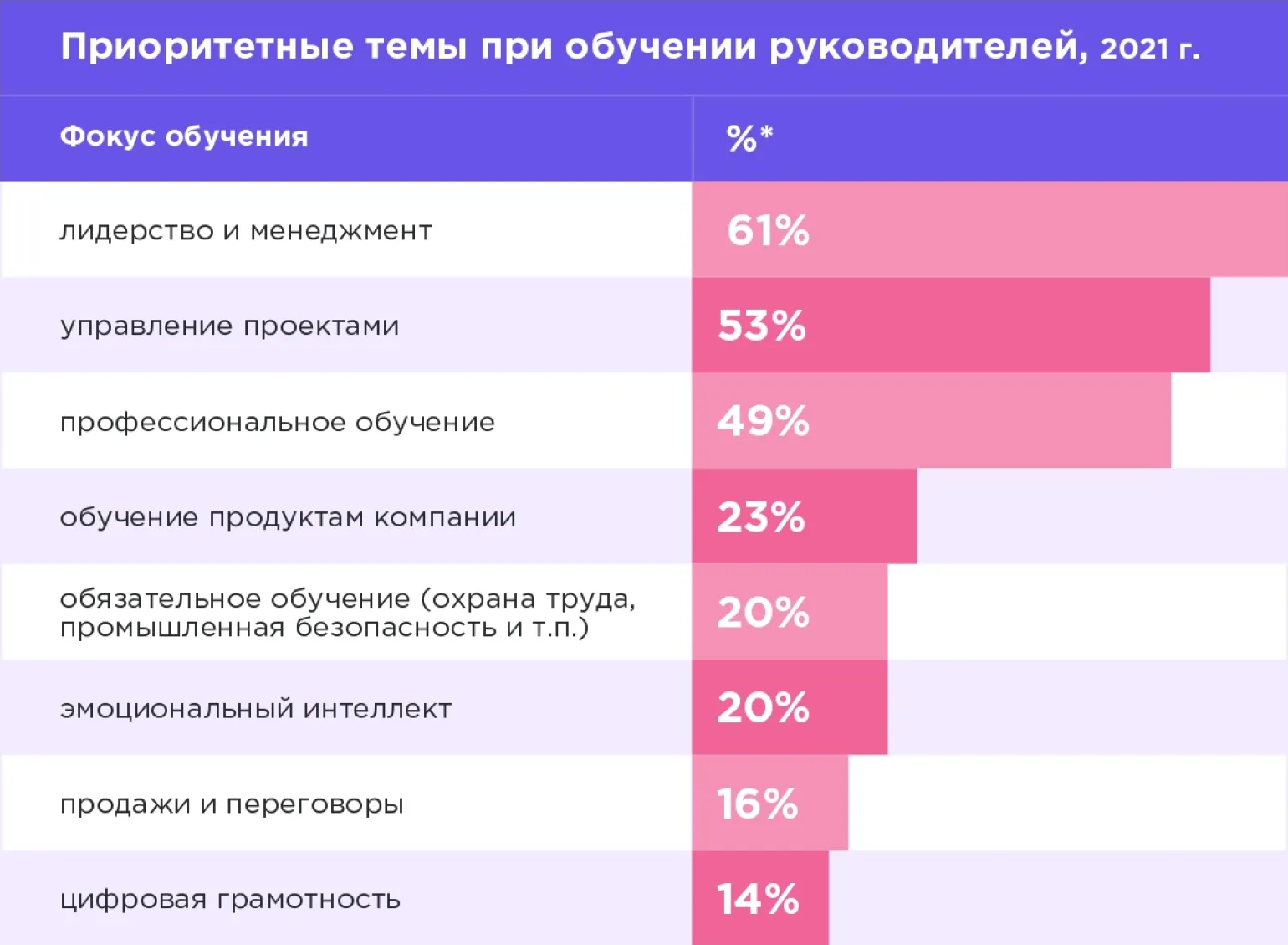 Результаты исследования 2021 года выявили характерные для руководителей в области обучения компетенции. Лидерство и менеджмент занимают первое место среди ключевых навыков. На втором месте расположилось управление проектами, а третье место занимает профессиональное обучение. Эти данные подчеркивают важность развития управленческих и проектных навыков для успешного функционирования в сфере образования и повышения эффективности обучающих программ.