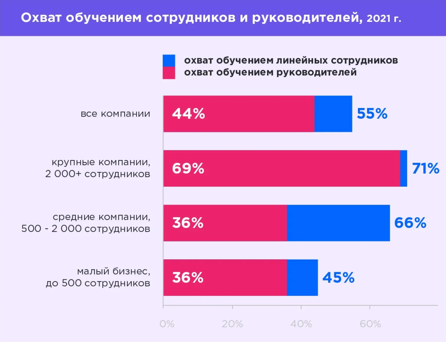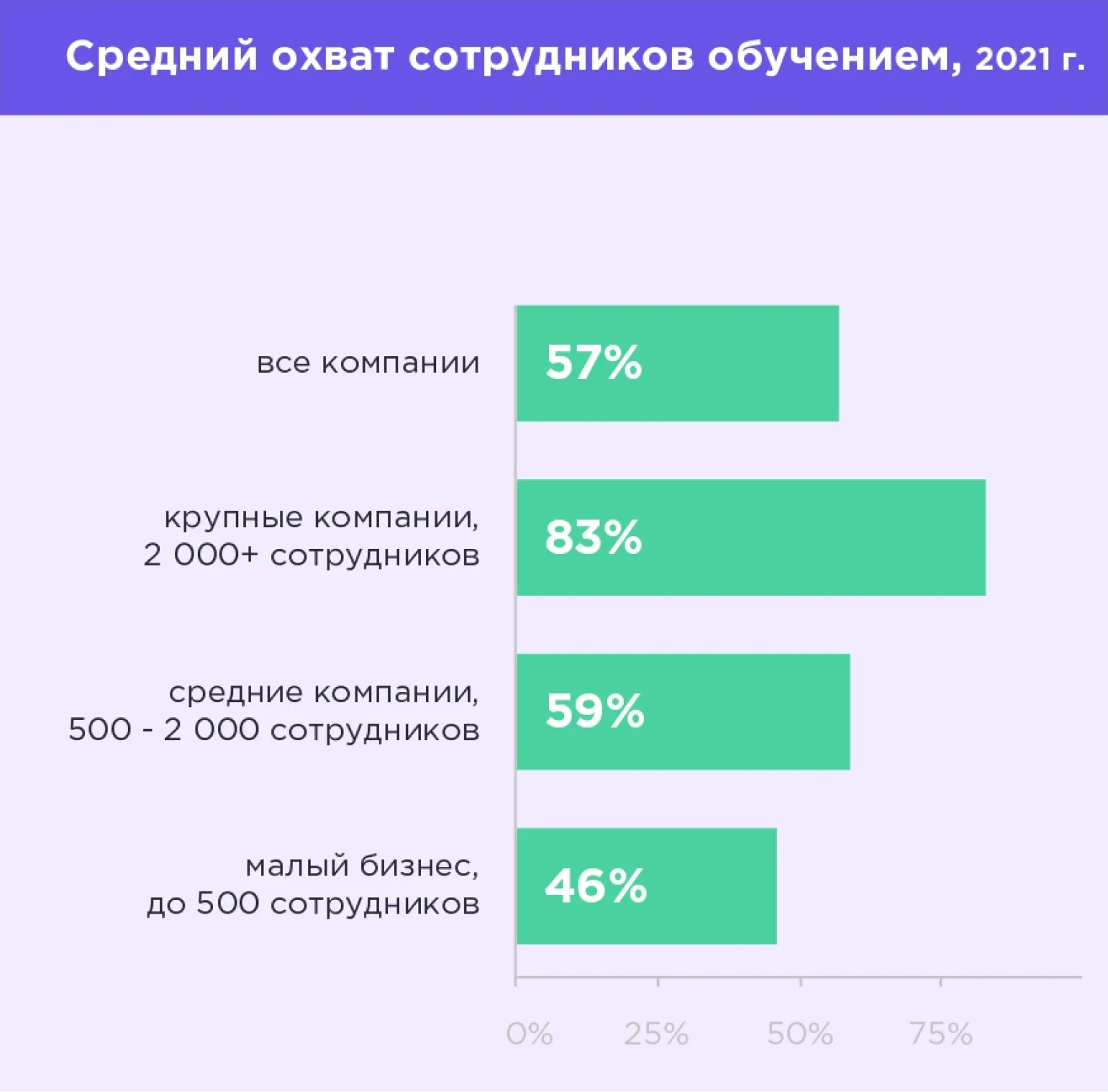 Исследования подтверждают, что размер компании напрямую влияет на уровень охвата обучения сотрудников. В 2021 году в крупных организациях обучение прошли 83% работников, в то время как в средних и малых бизнесах этот показатель составляет лишь 59% и 46% соответственно. Это свидетельствует о том, что крупные компании более активно инвестируют в развитие своих сотрудников, что может способствовать повышению их квалификации и общей эффективности работы. Важно отметить, что обучение работников не только повышает их профессиональные навыки, но и способствует формированию лояльности к компании, что является ключевым фактором для её успешного функционирования.