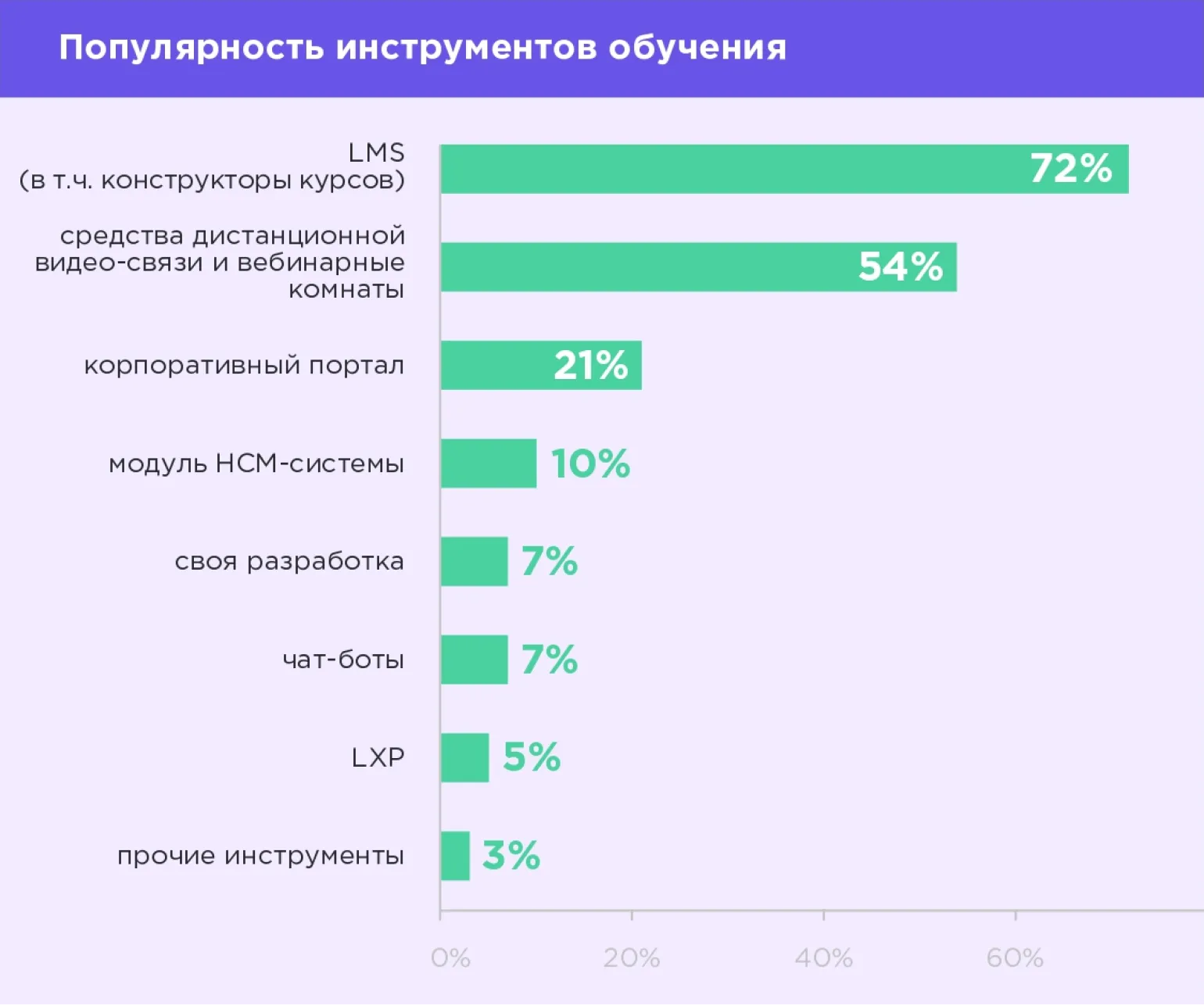 Самым востребованным инструментом среди участников опроса стали системы управления обучением (LMS). Это объясняется возможностью загружать собственные курсы и интегрировать арендованный контент, что подчеркивает значимость внутреннего обучения в современных организациях. LMS становятся неотъемлемой частью образовательного процесса, позволяя эффективно управлять обучением сотрудников и повышать их квалификацию.