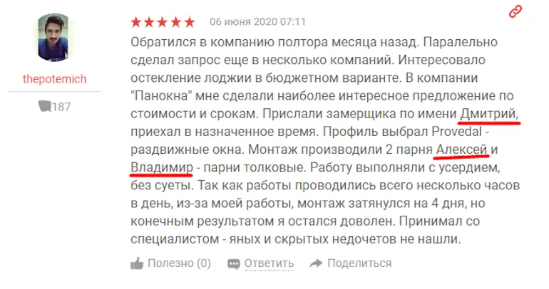 Отзыв, в котором упоминаются имена нескольких сотрудников, с которыми автор общался лишь один или два раза, может вызывать сомнения в его достоверности. Запоминаете ли вы имена людей, с которыми встречались всего один раз? Нередко такие отзывы могут быть сфабрикованы или искажены, что ставит под сомнение их ценность для потенциальных клиентов или партнеров. Важно учитывать, что подлинные отзывы основываются на глубоком взаимодействии и реальном опыте.