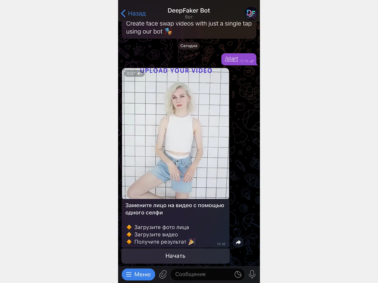 DeepFaker Bot – это революционный инструмент, который использует нейросети для создания видео на основе загруженной фотографии или другого видео. Процесс прост: загрузите изображение лица и видео, в котором хотите заменить лицо. Бот обработает данные и отправит вам готовый результат. Это идеальное решение для создателей контента и видеооператоров, желающих экспериментировать с визуальными эффектами.