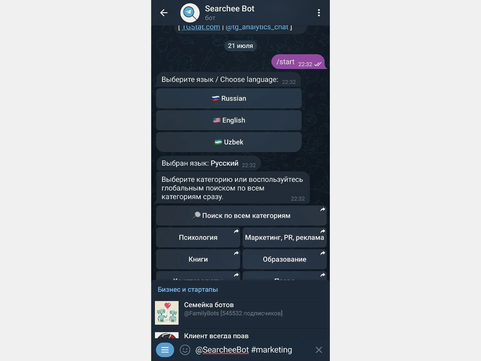 Searchee Bot упрощает поиск каналов по интересующим вас темам, таким как бизнес, карьера, путешествия или медицина. Достаточно выбрать язык и категории, и бот предоставит вам список актуальных каналов.