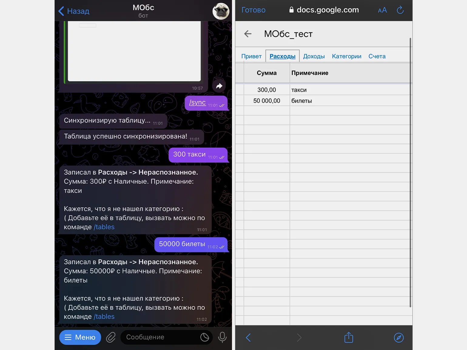 МОбс ведет учет ваших финансов с помощью Google Таблиц. Создайте таблицу, дайте боту доступ к редактированию, и вы сможете вносить данные о своих расходах и доходах в удобном формате, например: «50 кино» или «2500 зарплата».