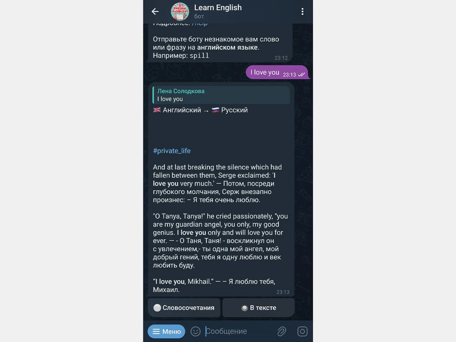 Бот Learn English предлагает удобный перевод слов и фраз с английского на русский язык. Он также предоставляет примеры использования слов в контексте, что способствует лучшему пониманию языка.