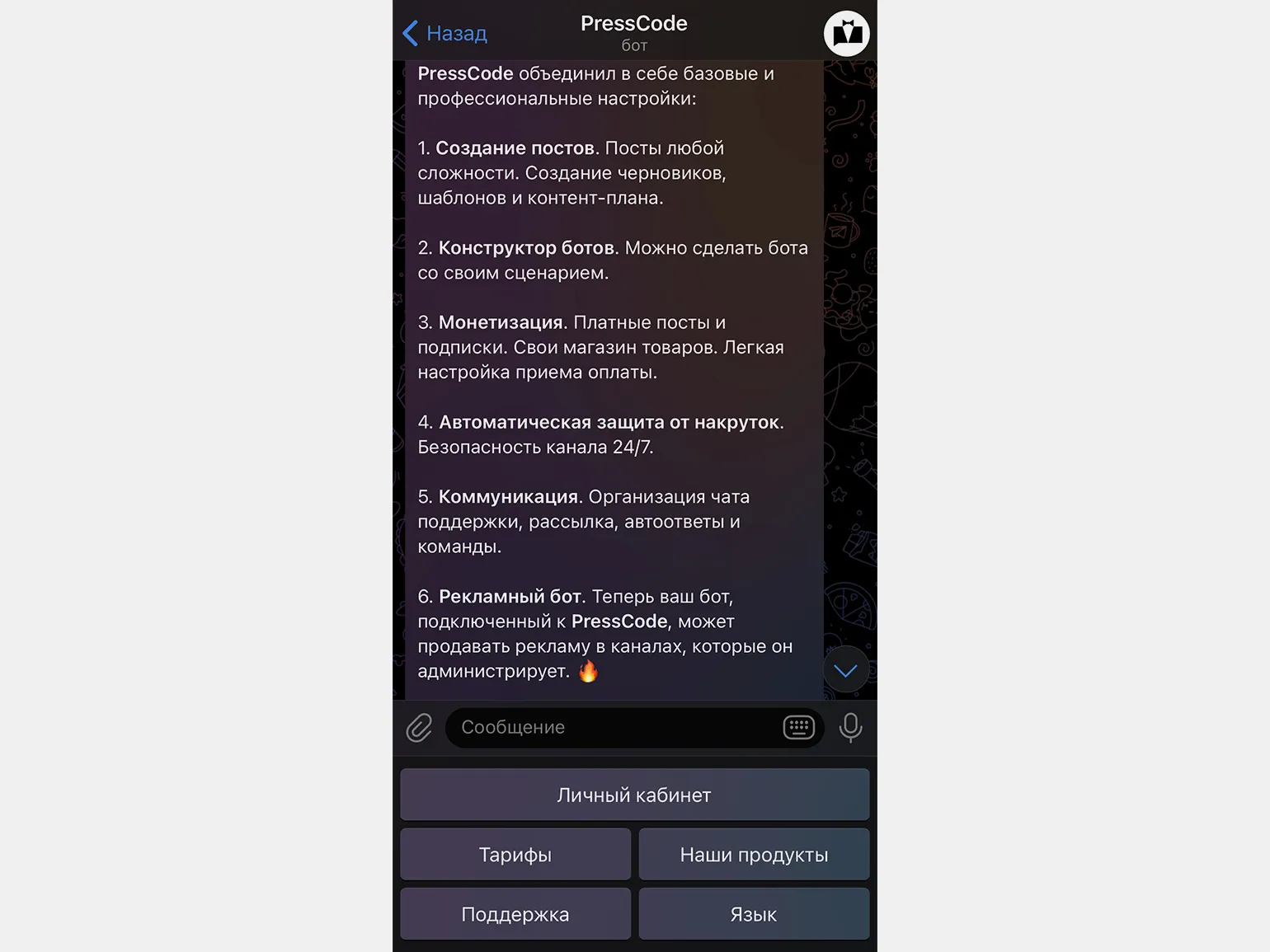 Кроме того, PressCode позволяет запустить монетизацию канала, настраивая систему подписок для закрытых групп. Бот также оснащен функцией автоматических ответов в чатах и эффективными средствами борьбы с накруткой подписчиков.