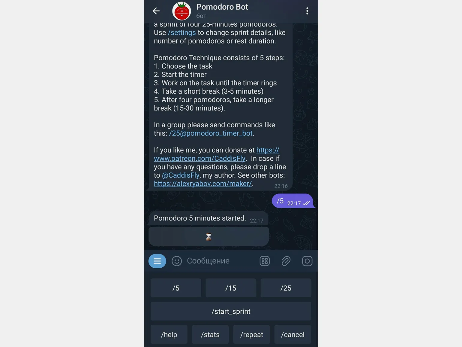С помощью Pomodoro Bot вы сможете эффективно организовать свое время. Бот запускает таймер на 15 или 25 минут работы, после чего предлагает 5 минут отдыха. Удобное меню позволяет легко управлять таймером, а уведомления помогут не забыть о перерывах.