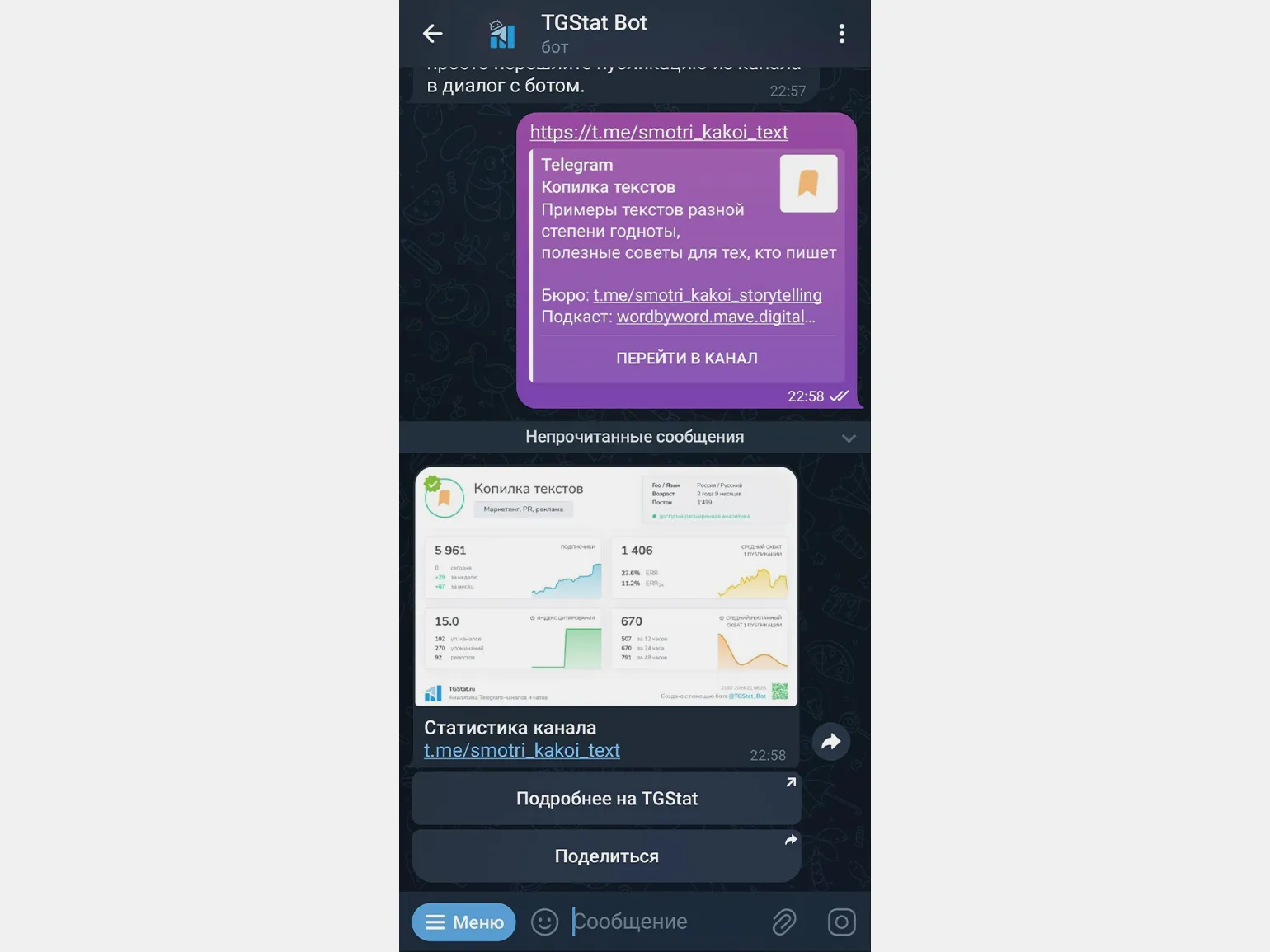 TGStat Bot — это официальный бот сервиса TGStat, который предоставляет статистику любого Telegram-канала, чата или публикации в удобном формате. Просто отправьте запрос, и бот вышлет вам актуальные данные.