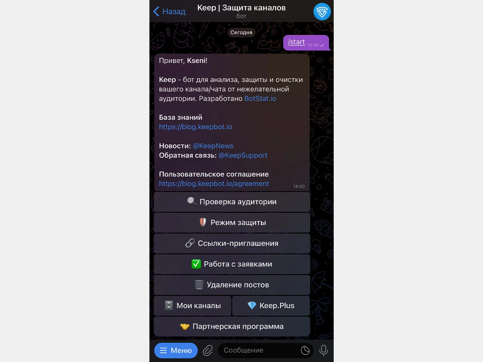 Бот также можно подключить для постоянного мониторинга. В случае атаки ботов на канал, «Keep» отправит уведомление администратору и начнет удалять подозрительных подписчиков.