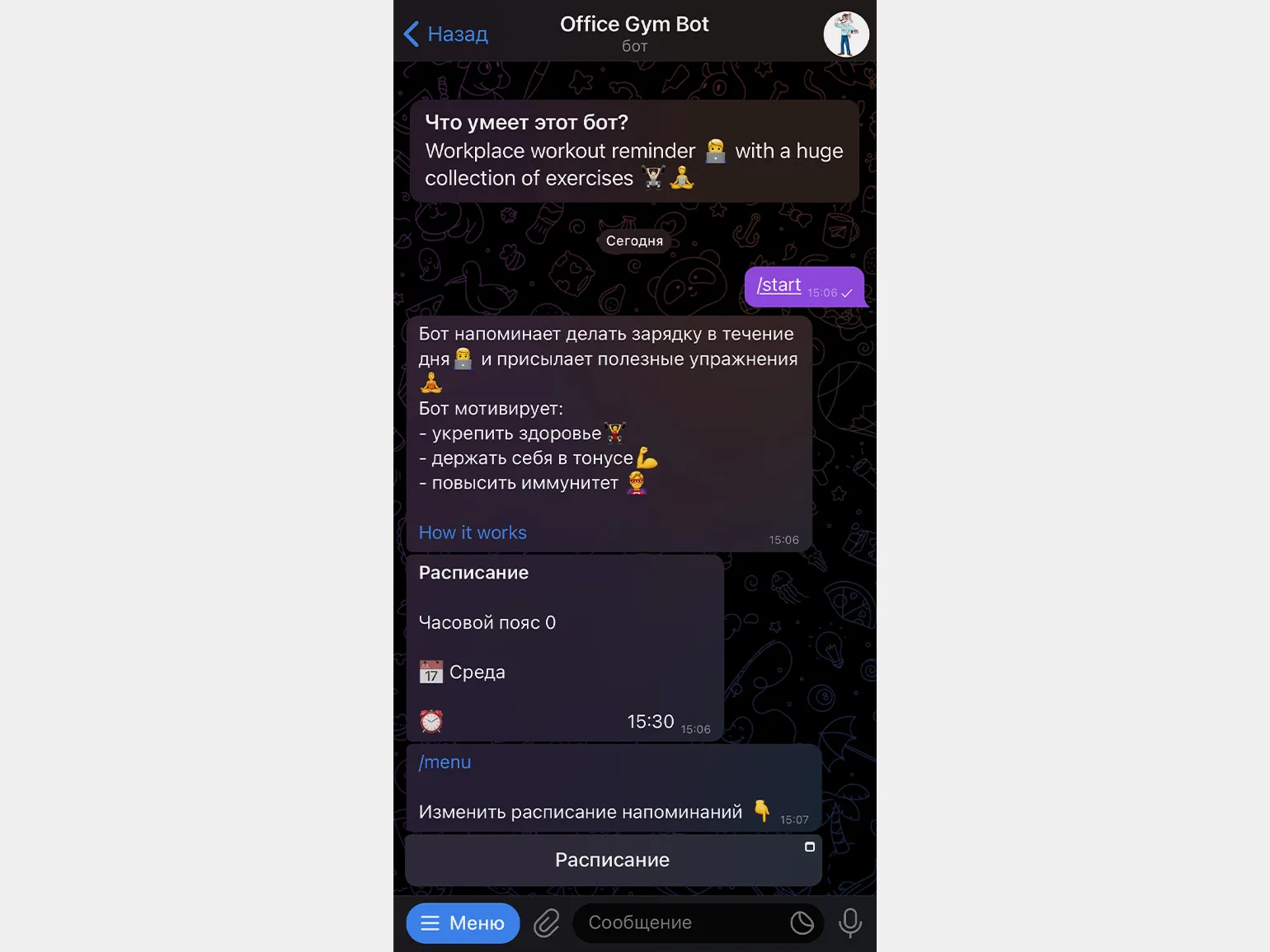 Office Gym Bot – это идеальный помощник для тех, кто работает в офисе и хочет оставаться активным. Бот напоминает вам о необходимости заниматься спортом в заранее установленное время и присылает простые, но эффективные упражнения, которые можно выполнять прямо на рабочем месте. Это отличный способ поддерживать физическую активность в течение рабочего дня.