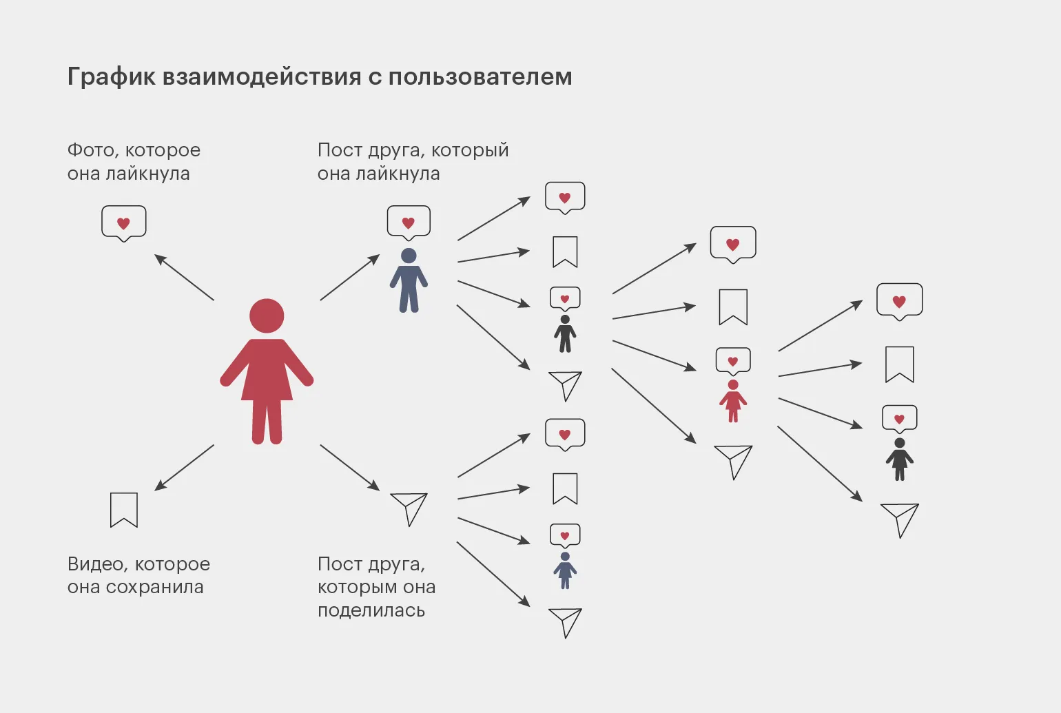 • Действия пользователей, такие как лайки, репосты, просмотры до конца, подписки и комментарии — важные метрики для алгоритмов.
