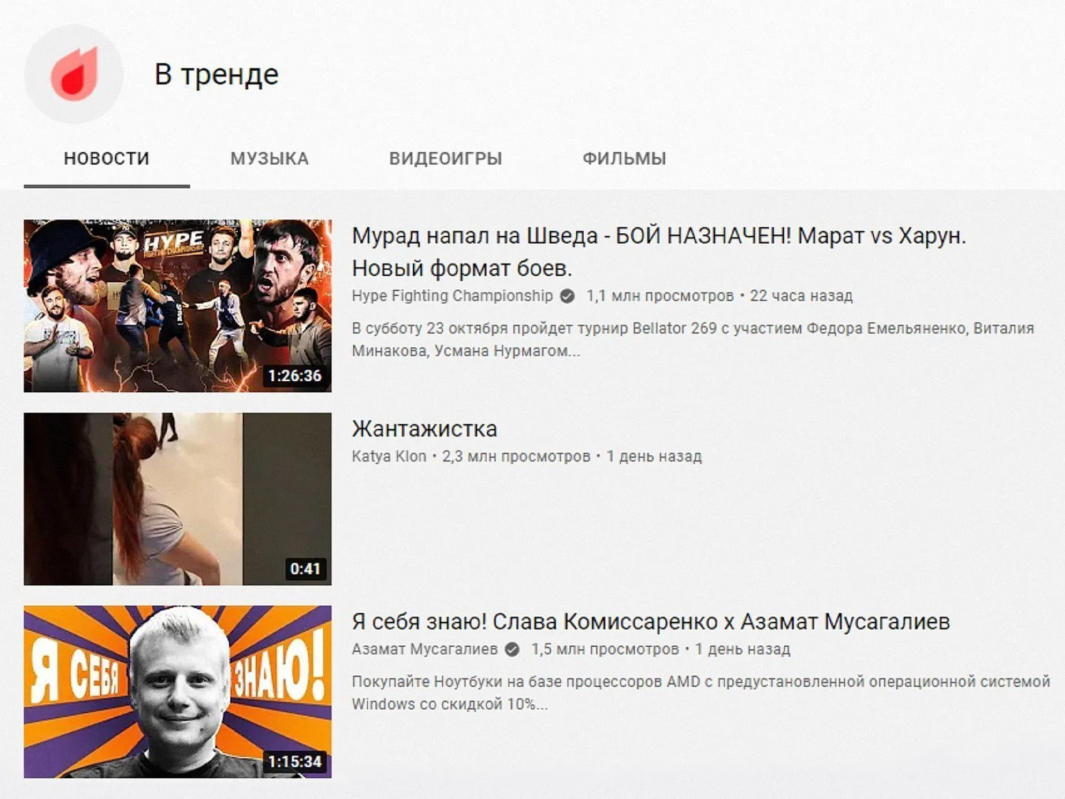 Раздел «В тренде» демонстрирует самые популярные видео в России. Скриншот: Герман Хватков / Skillbox Media