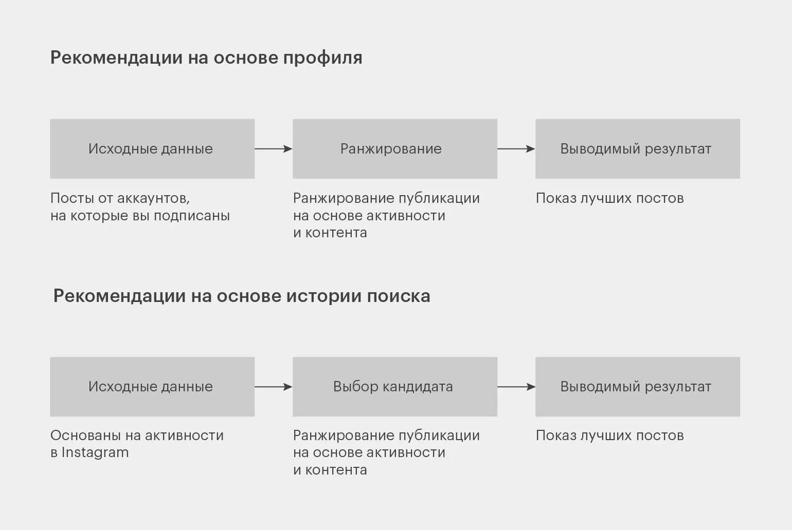 Схема формирования вкладки «Интересное» в Instagram. Инфографика: Майя Мальгина / Skillbox Media. Источник: блог Instagram.