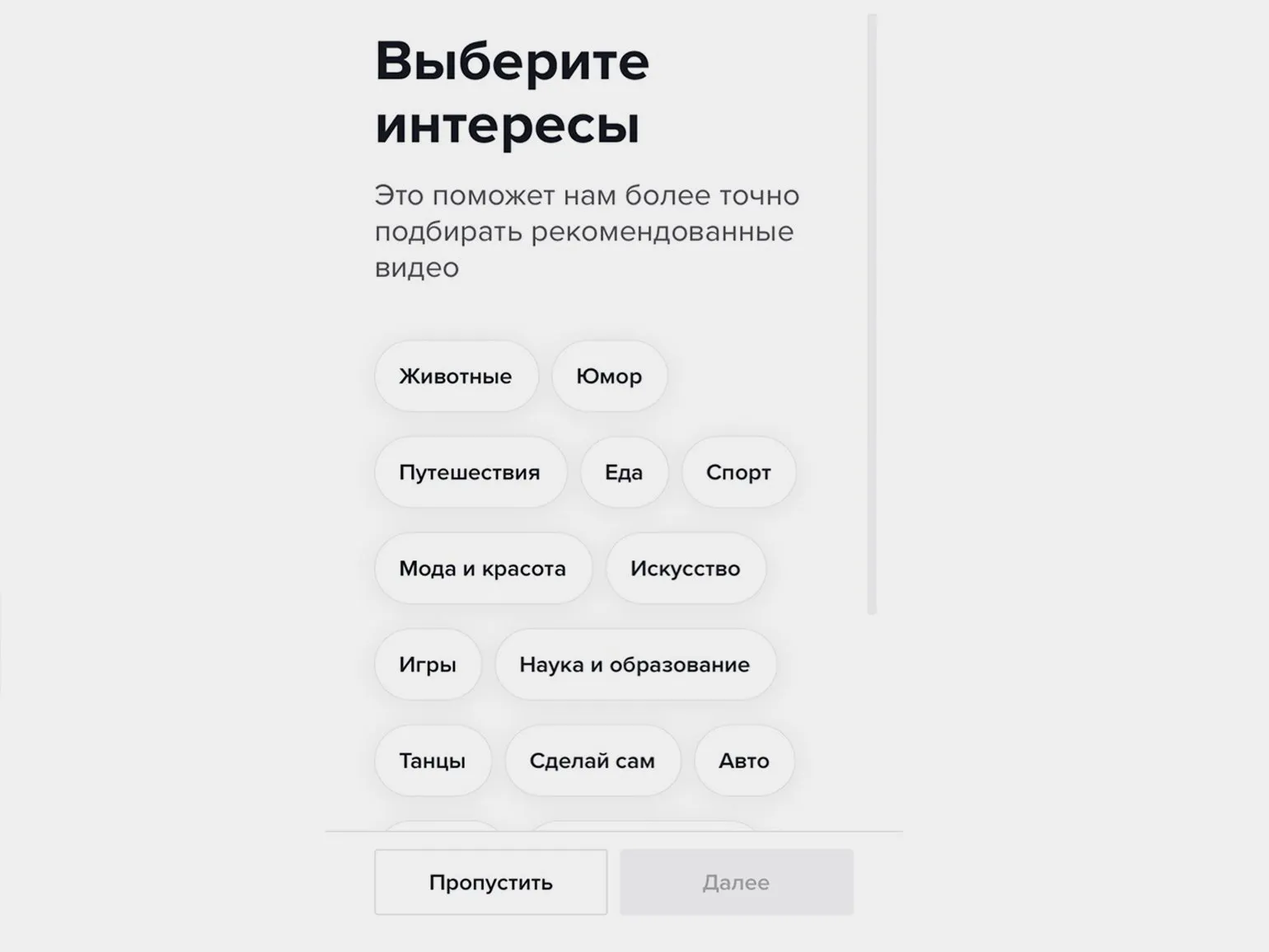 Выбор интересов в TikTok при регистрации. Это редкость для социальных сетей. Скриншот: Герман Хватков / Skillbox Media