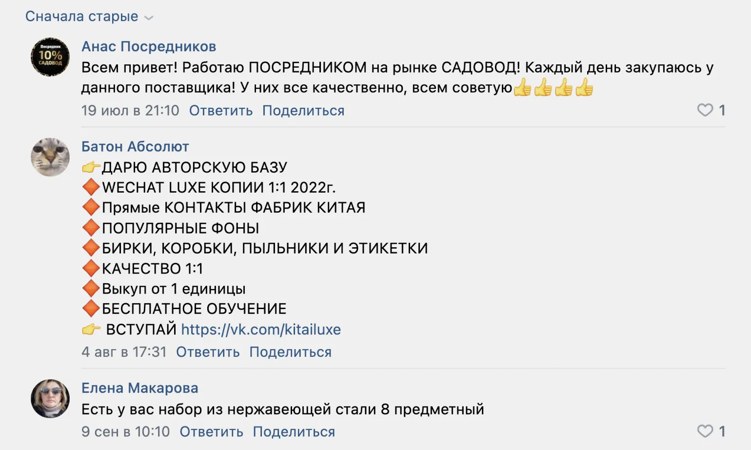 Пример публичного спама — в комментариях к посту поставщика человек рекламирует базу поставщиковСкриншот: «ВКонтакте»