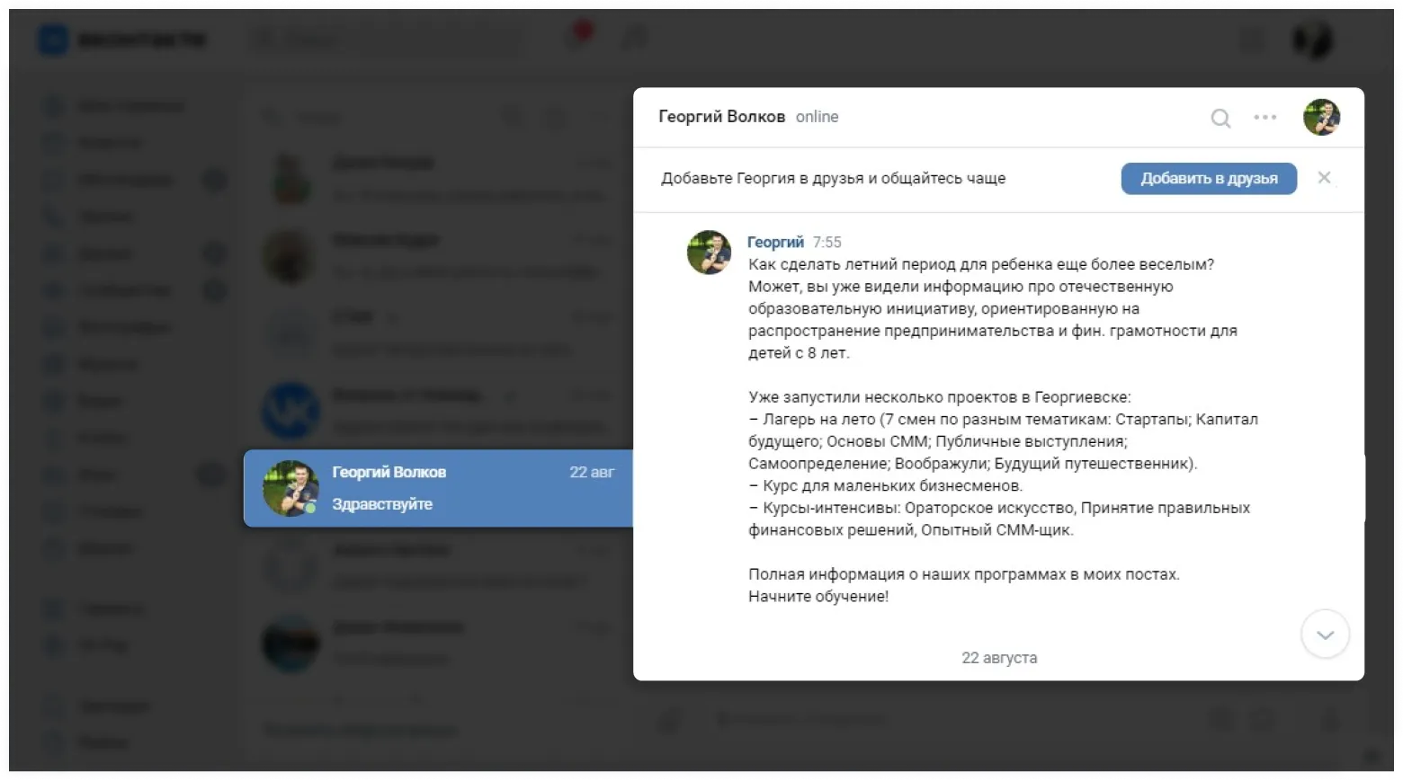 Пример рекламного спама — человек продвигает услуги летнего лагеря для детейСкриншот: Skillbox Media