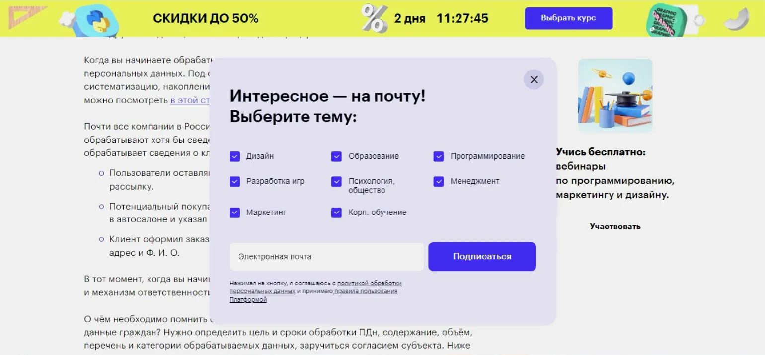 Пример законного сбора контактов: человек сам указывает почту и соглашается на получение рассылкиСкриншот: Skillbox Media