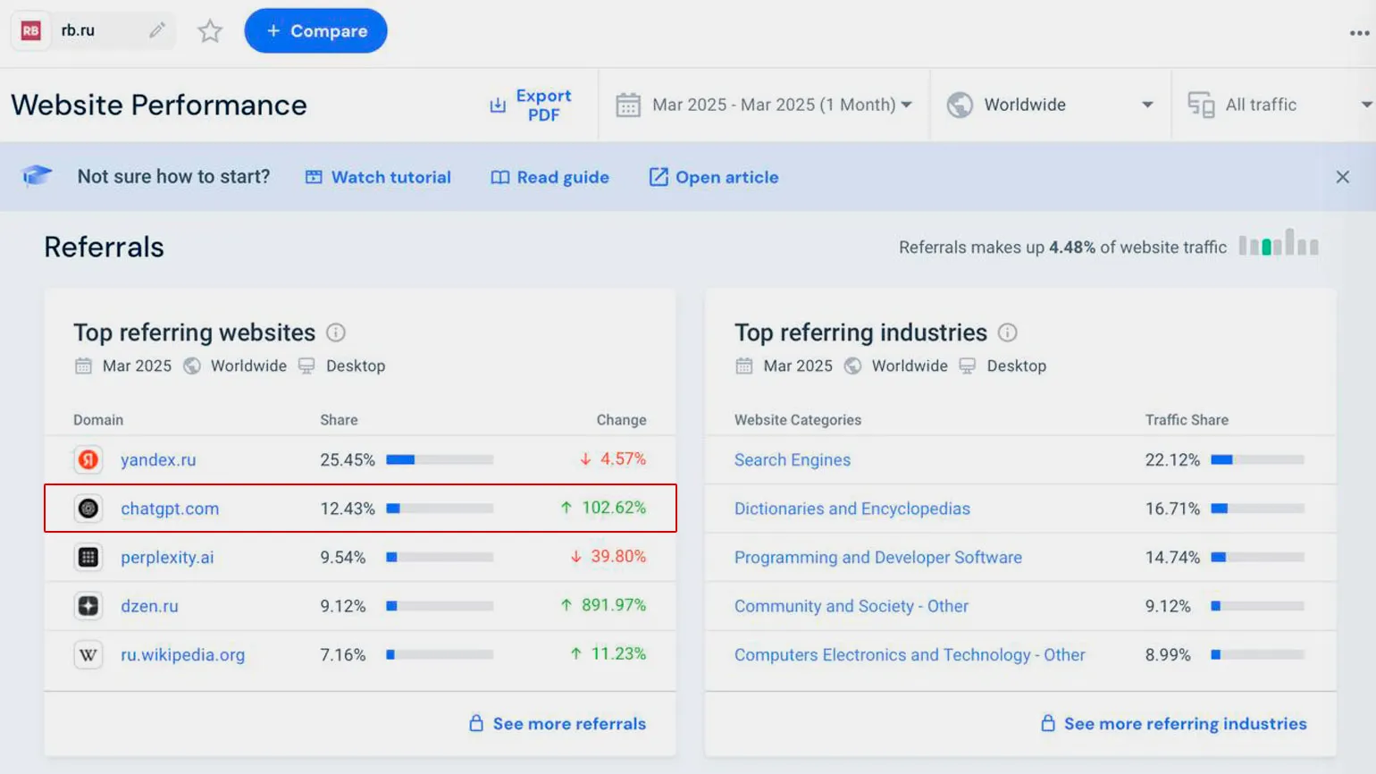 В современных системах аналитики мы можем наблюдать переходы пользователей из таких источников, как ChatGPT Search, Perplexity и другие нейросети. Эти данные доступны в инструментах анализа, таких как Similarweb и «Яндекс Метрика», в отчетах по источникам трафика. Это подчеркивает растущую значимость нейросетевых поисковых систем в веб-аналитике и их влияние на поведение пользователей. Учет этих переходов позволяет более точно оценивать источники трафика и оптимизировать стратегии цифрового маркетинга.