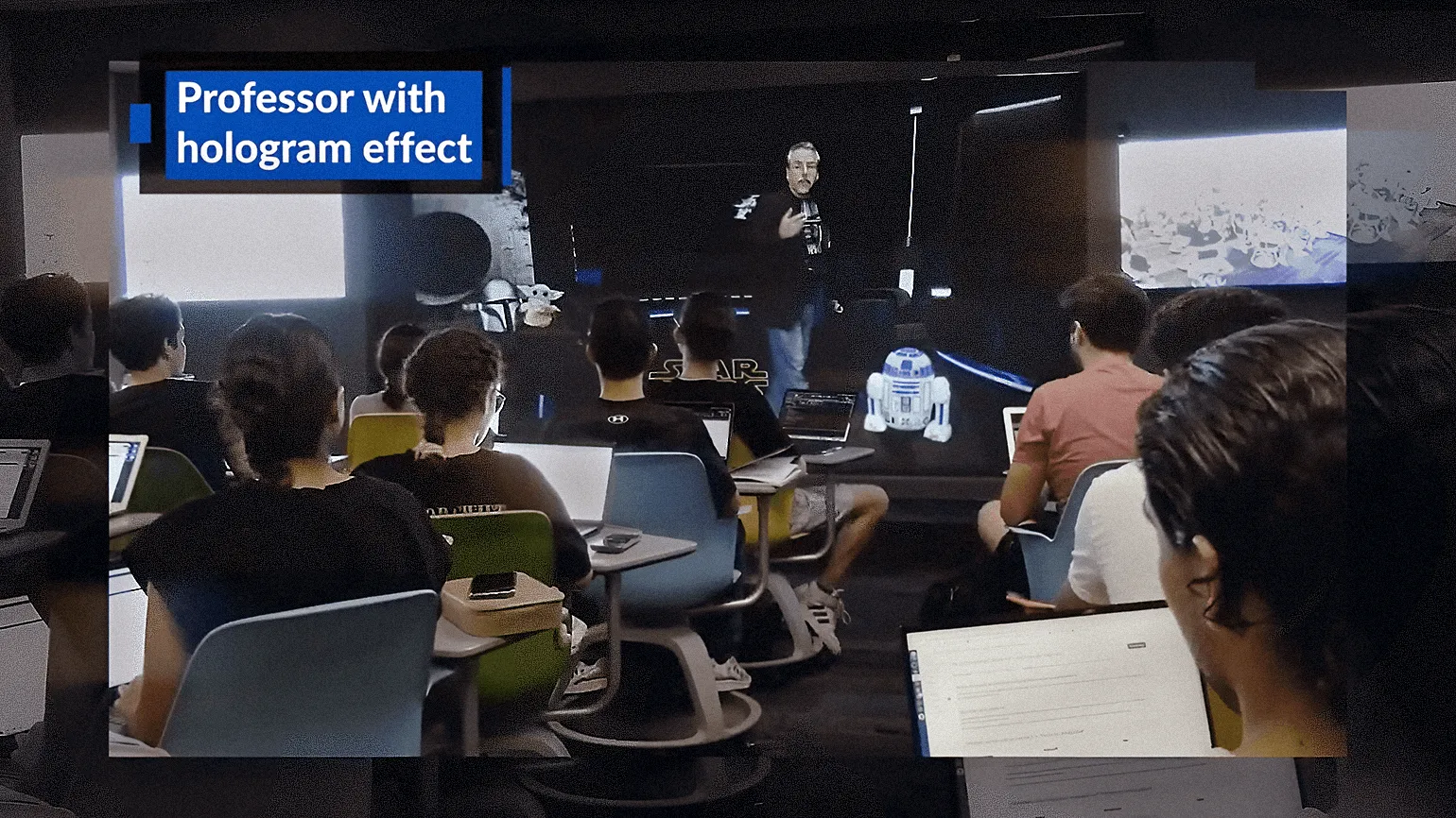 Holoroom — это инновационное пространство, созданное для решения проблемы «говорящей головы» в онлайн-лекциях. Студенты находятся в аудитории, где установлен специальный экран, на который выводится голографическая 3D-проекция преподавателя в натуральную величину, что напоминает сцены из «Звёздных войн». Преподаватель в это время находится в студии, оснащённой камерами, которые снимают его с разных ракурсов. Он может видеть и слышать студентов, а также взаимодействовать с ними в реальном времени. Благодаря точной передаче движений и жестов преподавателя создаётся ощущение его физического присутствия в аудитории. Эта технология разрабатывается и тестируется институтом с 2013 года и используется не только для обучения, но и для проведения дистанционных научных конференций. Holoroom представляет собой уникальное решение, которое объединяет технологии и образование, обеспечивая высокий уровень взаимодействия между преподавателями и студентами.