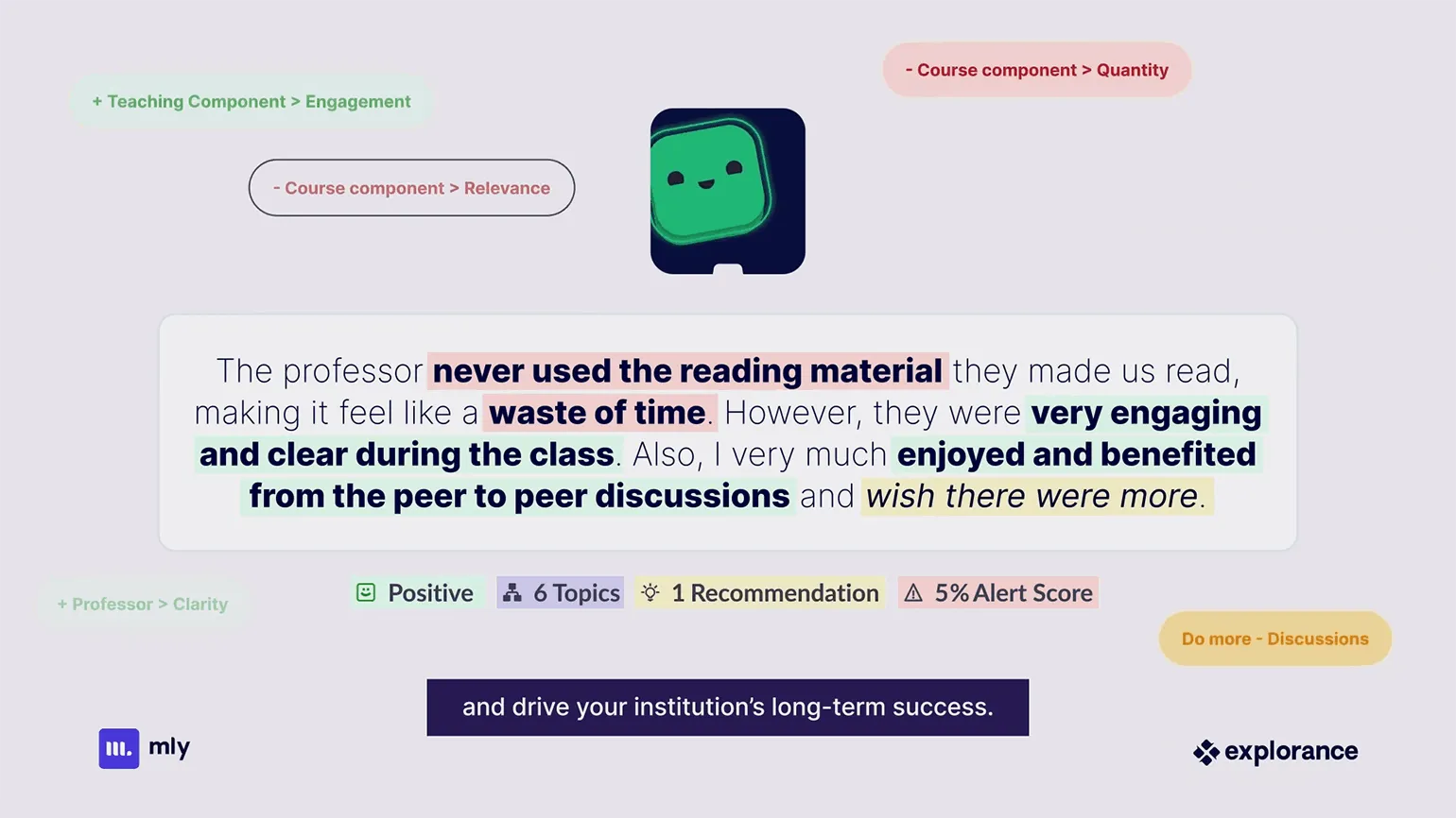 Платформа анализирует темы и эмоциональную окраску сообщений, а также сортирует комментарии в зависимости от социально-демографических характеристик авторов. Она выявляет конкретные проблемы и определяет, требуют ли они срочного вмешательства. Однако ключевым преимуществом MLY является то, что она предоставляет рекомендации для решения выявленных проблем. Например, платформа может советовать увеличить время, отведенное студентам на выполнение домашних заданий, или чаще использовать групповые формы работы. Это делает MLY не просто инструментом анализа, а активным помощником в образовательном процессе.