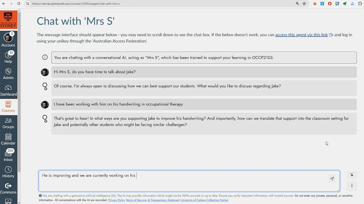 В платформе Cogniti существует возможность создания персонажей, что открывает новые горизонты для образовательного процесса. Преподавательницы Университета Сиднея разработали виртуальную учительницу «Миссис С» для курса по эрготерапии. В этом классе присутствует мальчик, который сталкивается с трудностями в письме от руки. Студенты получают задание предложить «Миссис С» рекомендации для улучшения почерка этого ученика. Важно, чтобы предложения были четкими и обоснованными, а также оценивались с точки зрения их практической реализации в обычном классе. Такой подход способствует развитию аналитического мышления и практических навыков у будущих специалистов в области эрготерапии.