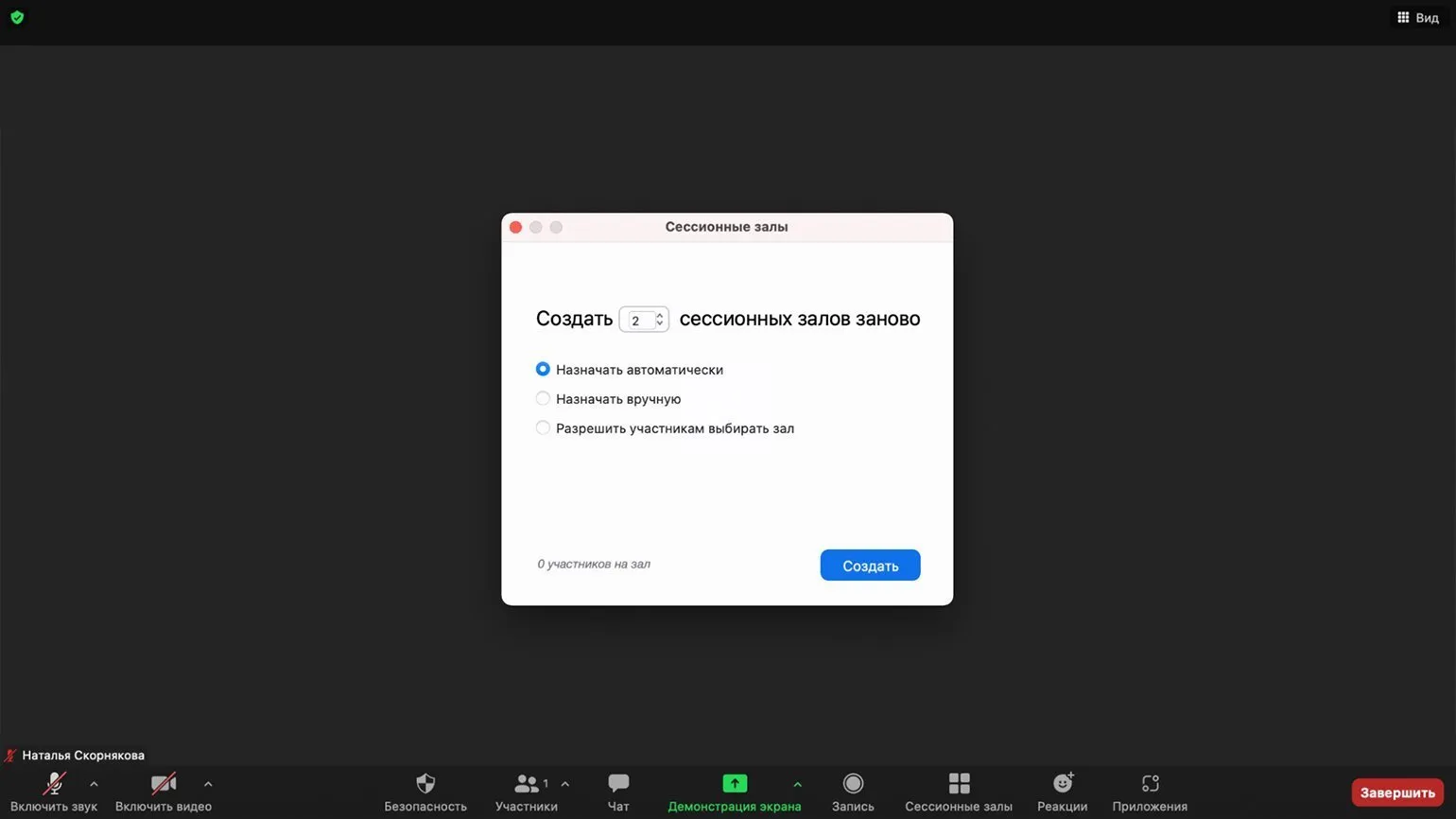 Теперь у вас есть возможность открывать сессионные залы прямо во время конференции — на нижней панели появится специальная кнопка. В этом разделе можно настроить количество групп и способ распределения участников: вручную организатором, автоматически или по выбору пользователей. Организатор имеет доступ ко всем группам и может в любое время перемещать участников между залами.