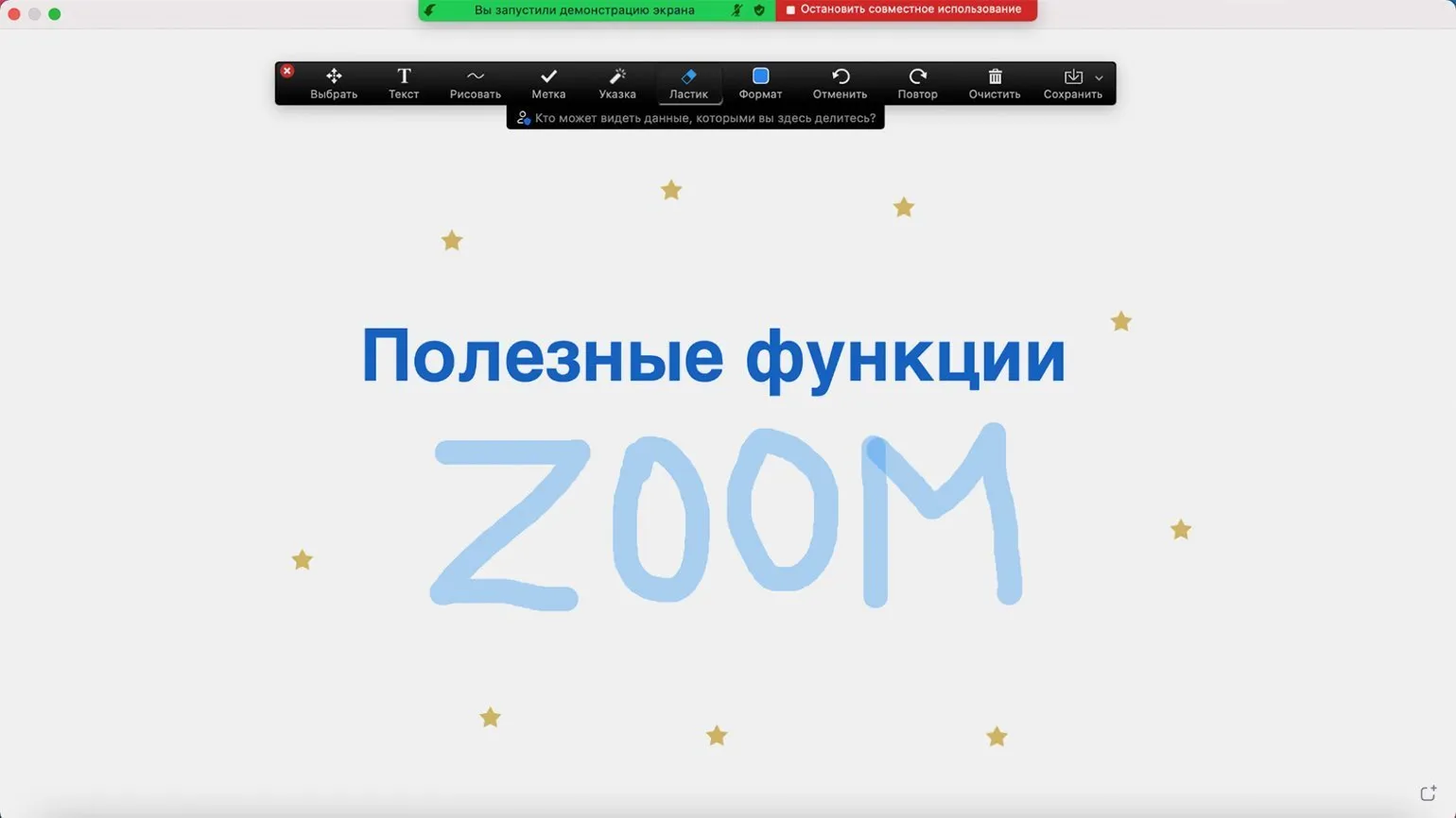Чтобы открыть доску, нажмите на кнопку «Демонстрация экрана», затем выберите «Доска сообщений» и нажмите «Поделиться». На открывшейся странице вы сможете вводить текст и рисовать. Здесь также доступны инструменты, такие как виртуальная указка и метки-символы. Рисунок можно сохранить в формате PNG, нажав кнопку «Сохранить».