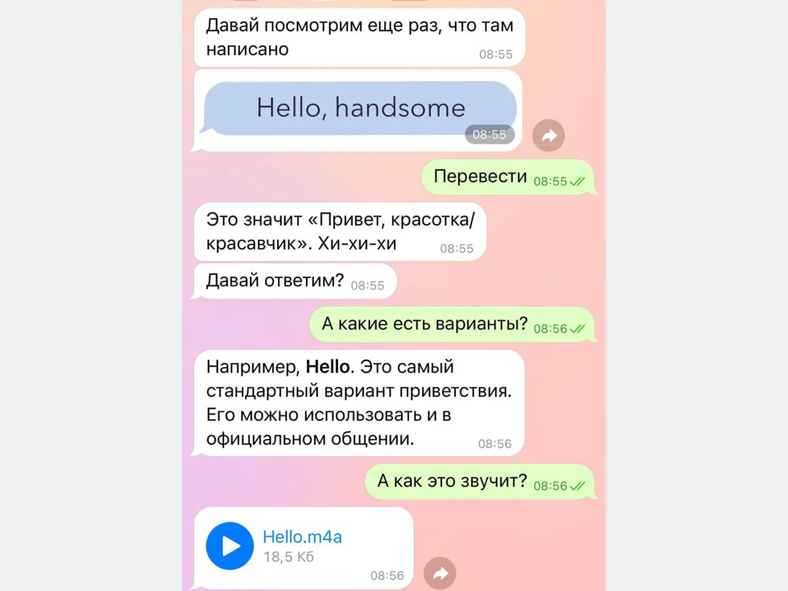 Студенты имели возможность влиять на ход беседы, хотя и в ограниченной степени. В начале диалога необходимо было выбрать пол потенциального собеседника, что задавало тон общению от имени мальчика или девочки. Кроме того, в некоторых случаях предоставлялся выбор варианта ответа, что создавало иллюзию управления диалогом. Такие элементы взаимодействия способствовали более активному участию студентов в обсуждении и повышали интерес к теме.