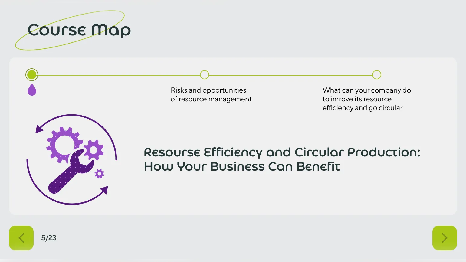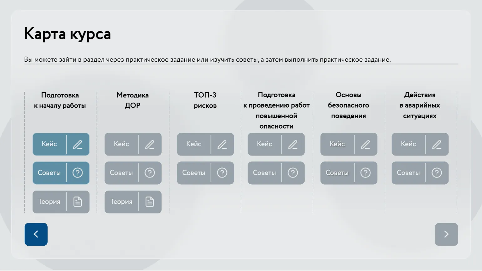 Карта курса представляет собой интерактивный слайд, на котором отображены все разделы курса. Она позволяет пользователю легко переходить к любому разделу как в заданной последовательности, так и в свободном порядке. Главное отличие от предыдущей версии заключается в кликабельности, что значительно упрощает навигацию и улучшает пользовательский опыт.