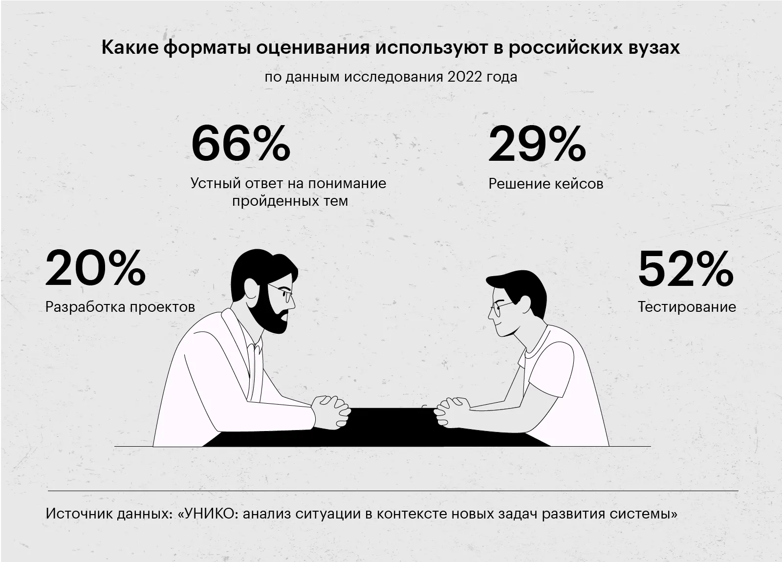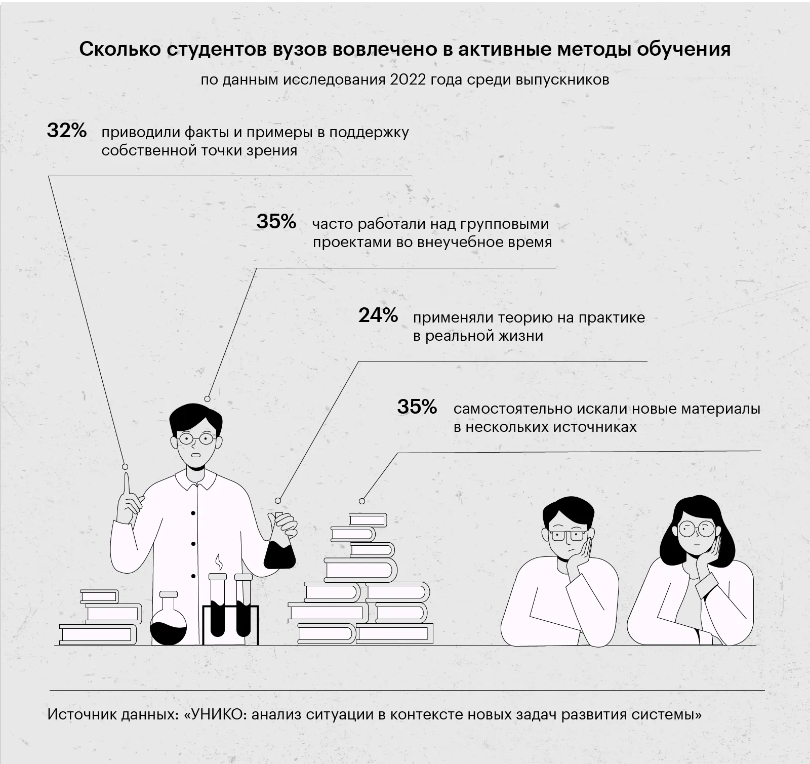 В современных вузах продолжают преобладать традиционные методы обучения, что приводит к недостаточной вовлеченности студентов в учебный процесс. Преподаватели часто придерживаются устаревших подходов, не используя активные формы обучения и инновационные методы оценивания. Между тем, опросы показывают, что студенты ожидают от высшего образования развития гибких навыков и опыта самоорганизации. Однако без перехода к более современным и интерактивным образовательным методам достичь этих целей становится крайне сложно.
