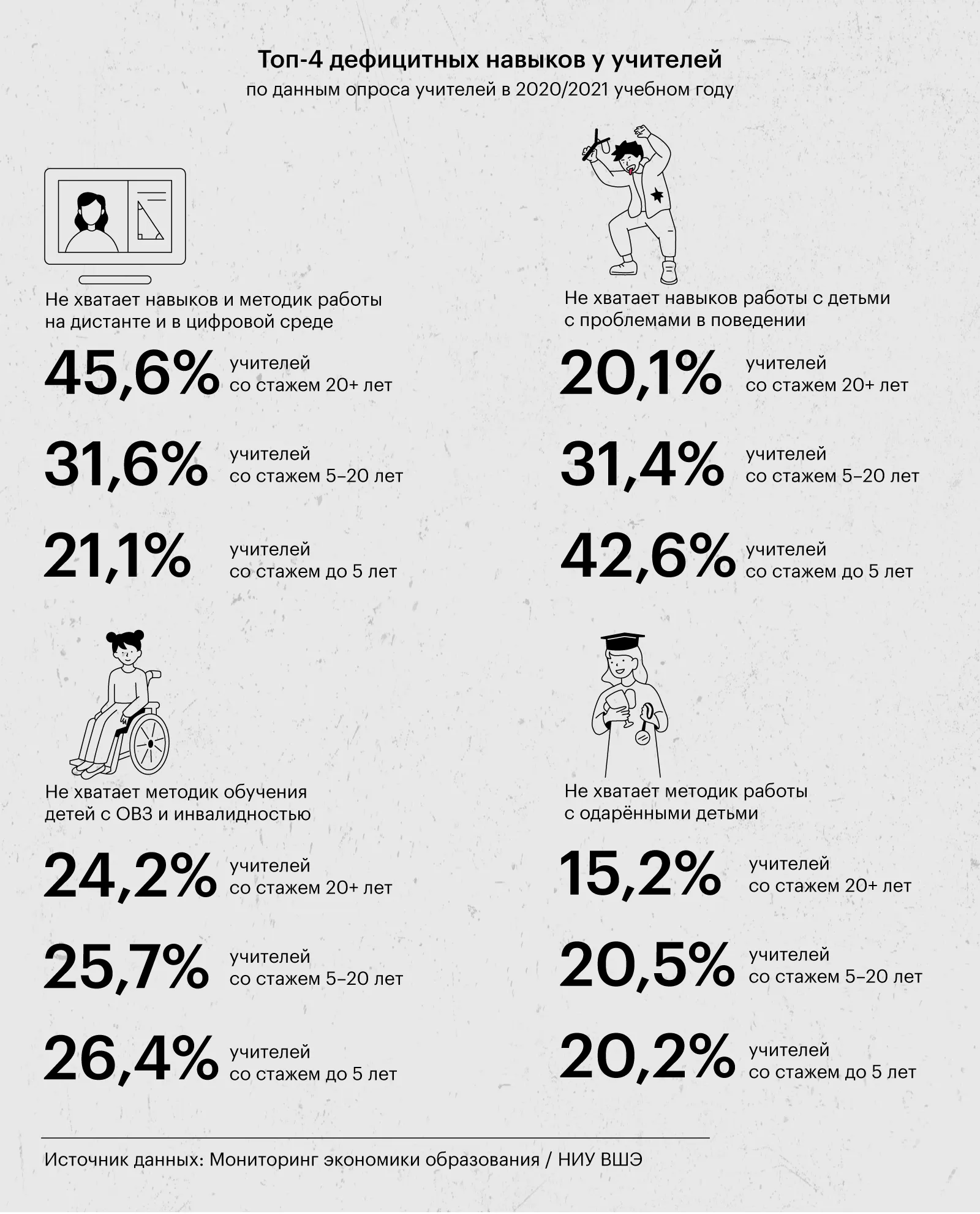 В новом информационном бюллетене НИУ ВШЭ, выпущенном в рамках Мониторинга экономики образования, были выявлены основные дефицитные учительские компетенции и методики обучения. Исследование показало, что некоторые из этих дефицитов зависят от стажа педагогов. Например, инфографика демонстрирует, что молодым учителям сложнее работать с детьми, испытывающими трудности в поведении, в то время как опытные педагоги сталкиваются с вызовами при использовании цифровых технологий. Также все учителя отмечают нехватку методик для работы с одарёнными детьми и детьми с ограниченными возможностями здоровья. Эти выводы подчеркивают необходимость повышения квалификации и обновления образовательных практик для улучшения качества обучения.